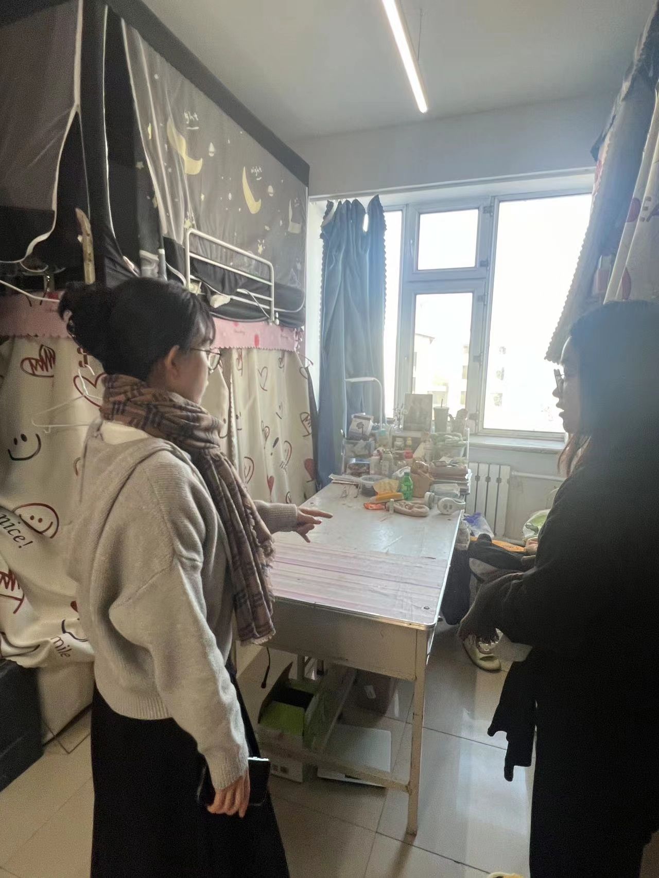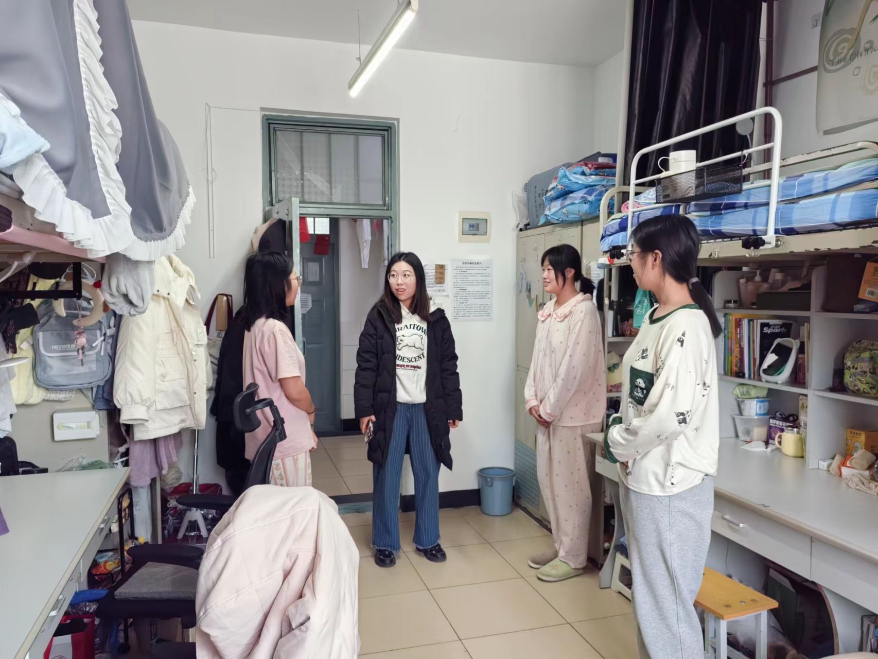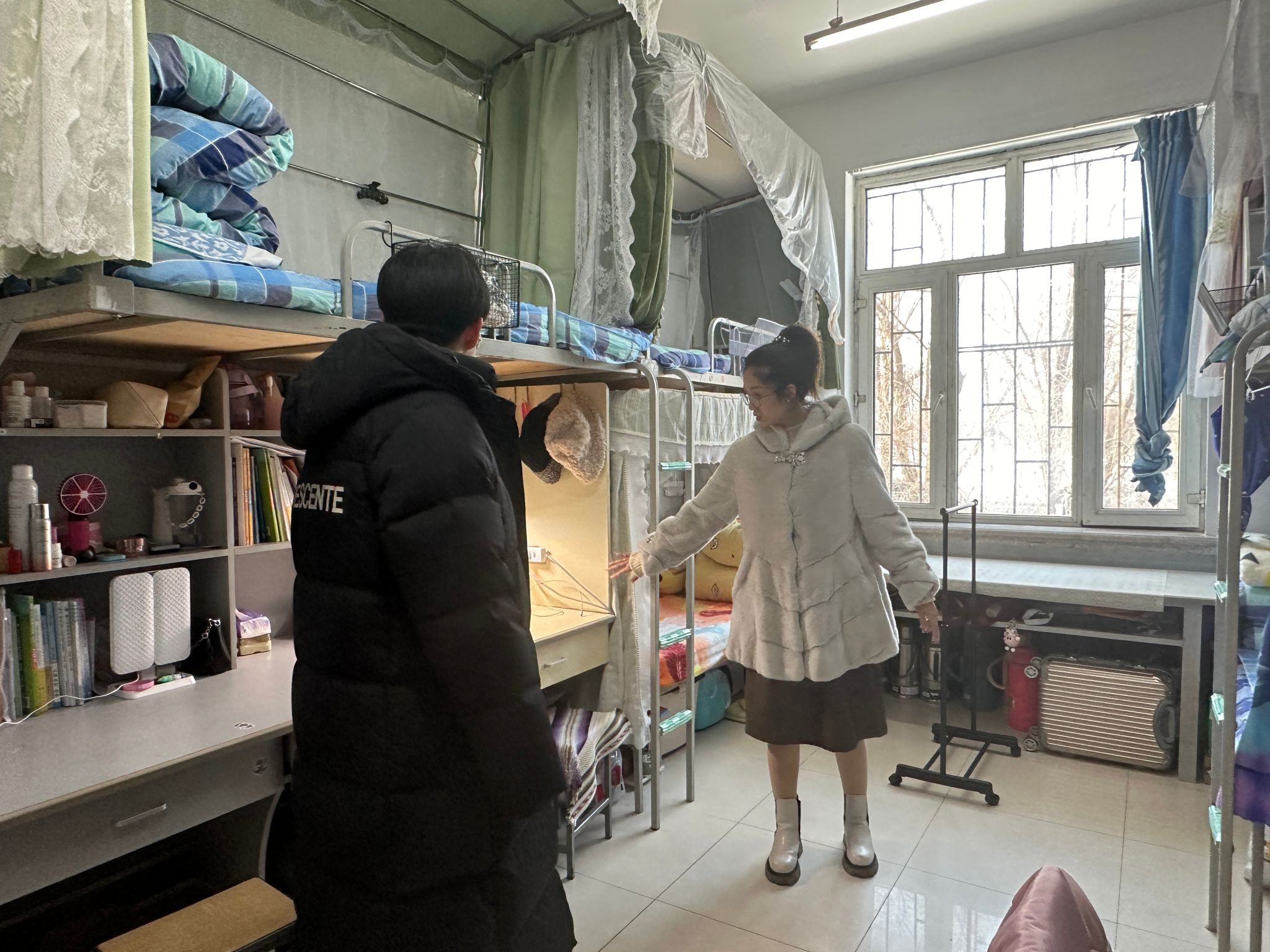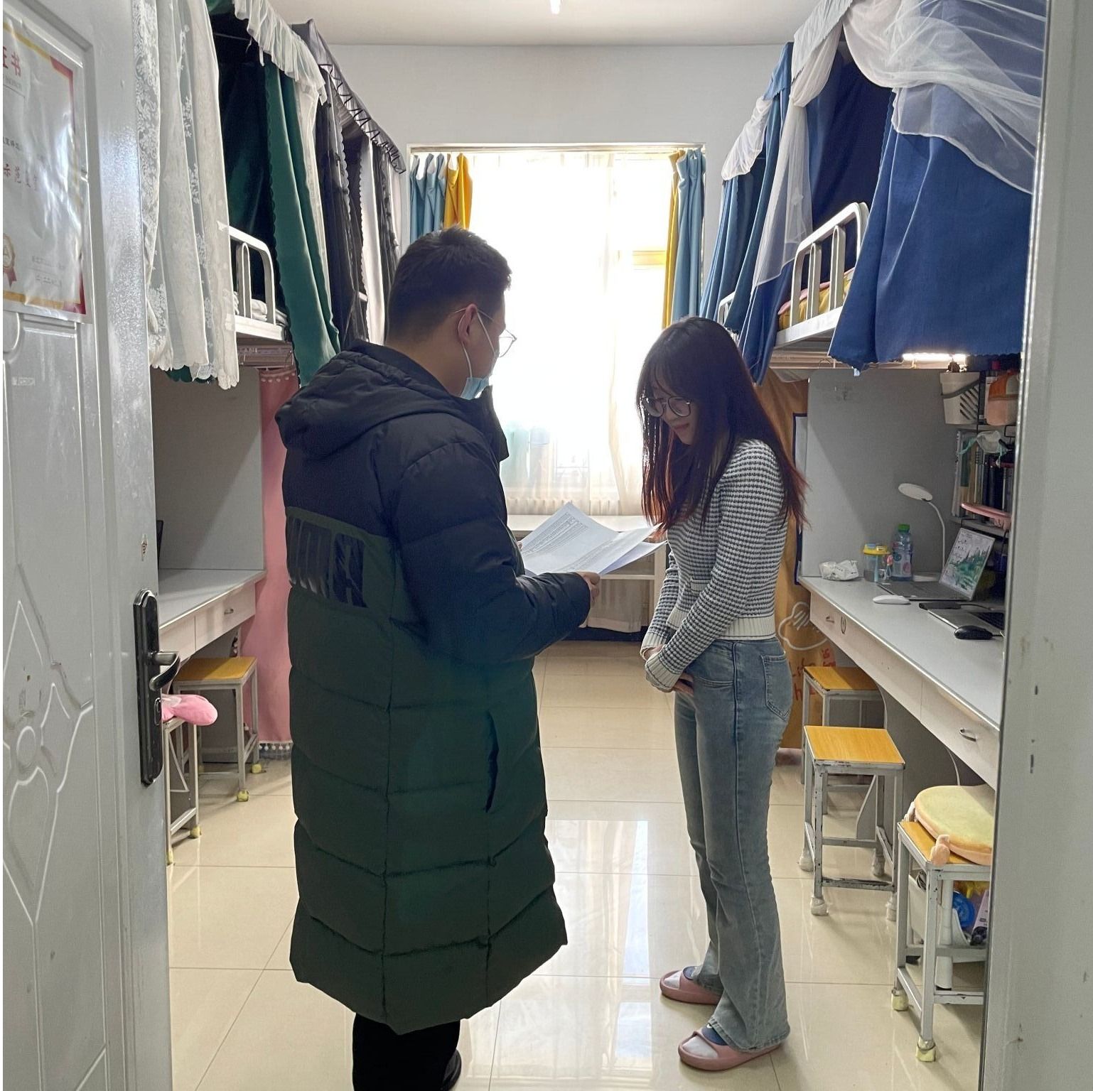 走访中,高天琦带领各年级辅导员与学生们就学业进展、未来规划、心理状态等问题开展深入交谈,引导学生规律作息,养成健康文明、积极向上的生活习惯。重点帮助考研学子开展考研规划咨询、考研政策讲解、压力情绪疏导等多形式交流,帮助学生坚定考研信心、减少考研疑惑、疏解焦虑情绪。每到一处,辅导员老师都仔细向同学们强调不能私拉电线、不能将电瓶车放置寝室内充电以及离开寝室一定要切断电源等事宜,并叮嘱同学们寝室内要互相关心、互相帮助,临近期末要努力复习,争取考取好成绩。