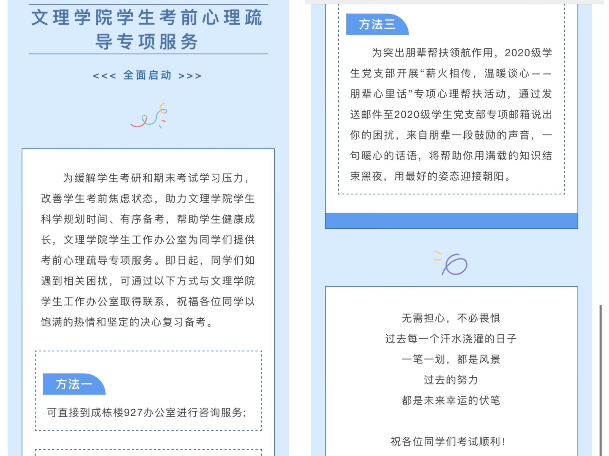 学院充分重视心理疏导工作,开通了考研学生心理疏导24小时热线,学生党支部开展了“薪火相传,温暖谈心——朋辈心里话”专项心理帮扶活动,学院辅导员在考研学生较为集中的图书馆设置心理咨询台,提供便捷心理咨询和疏导服务。