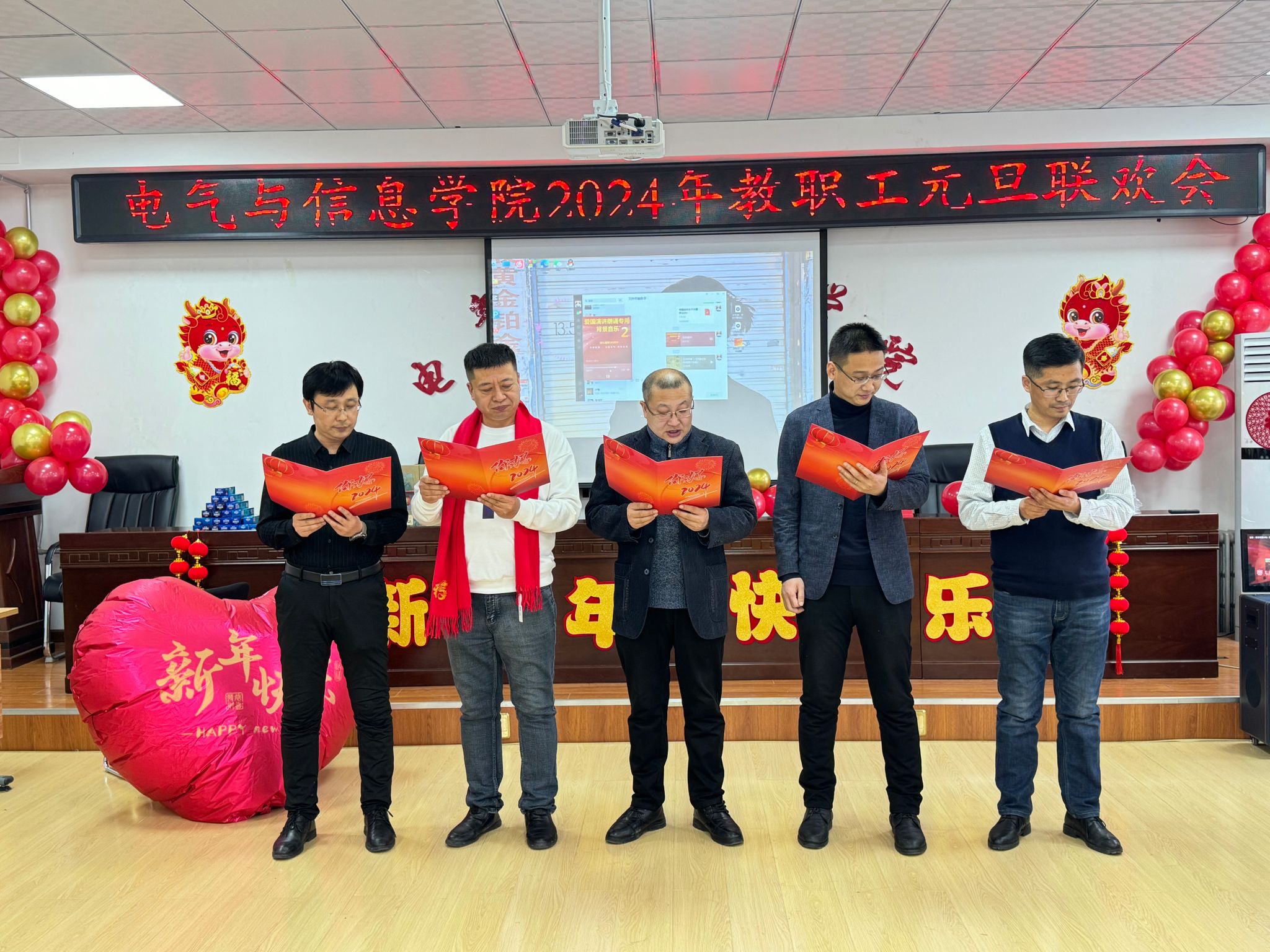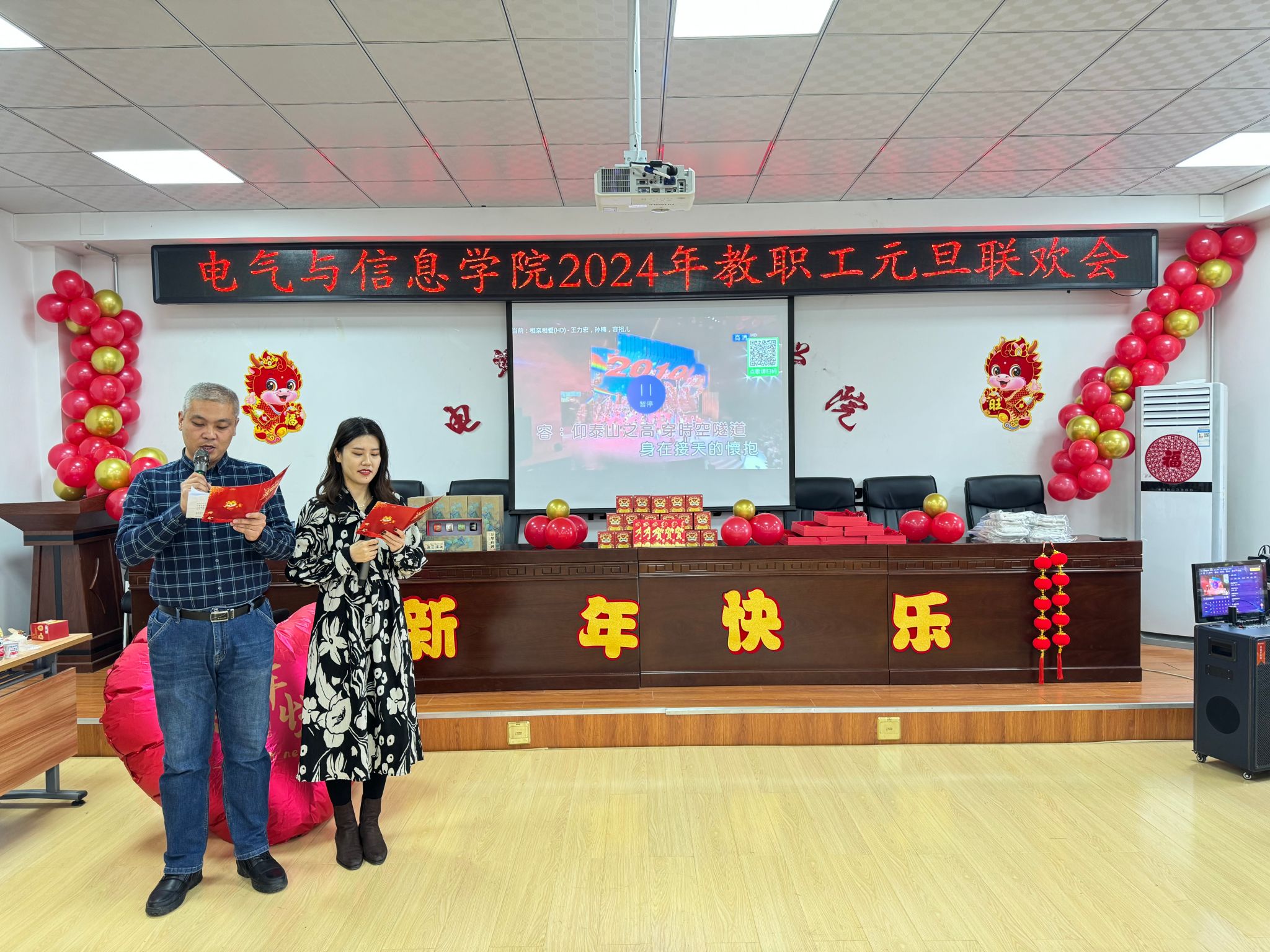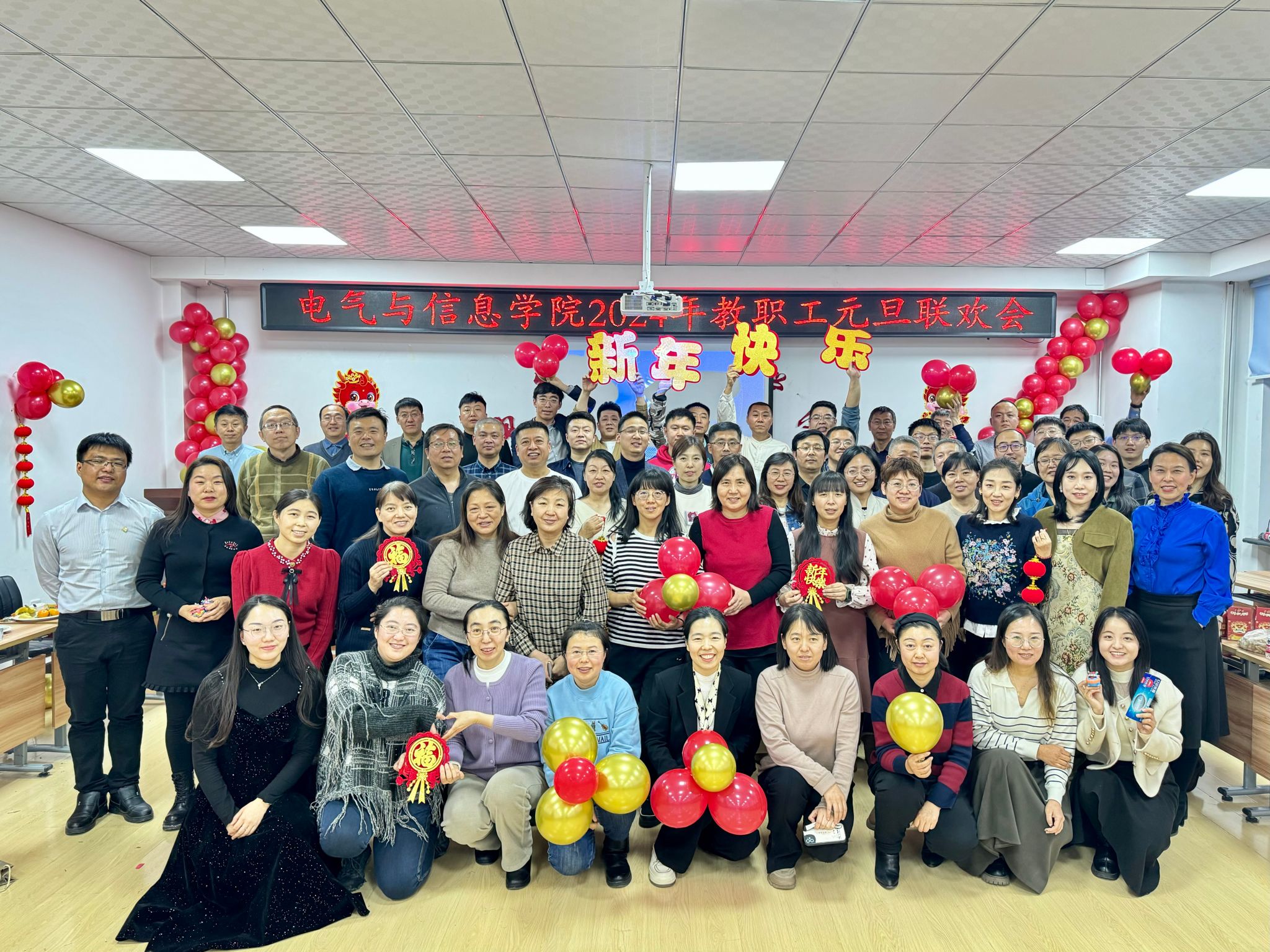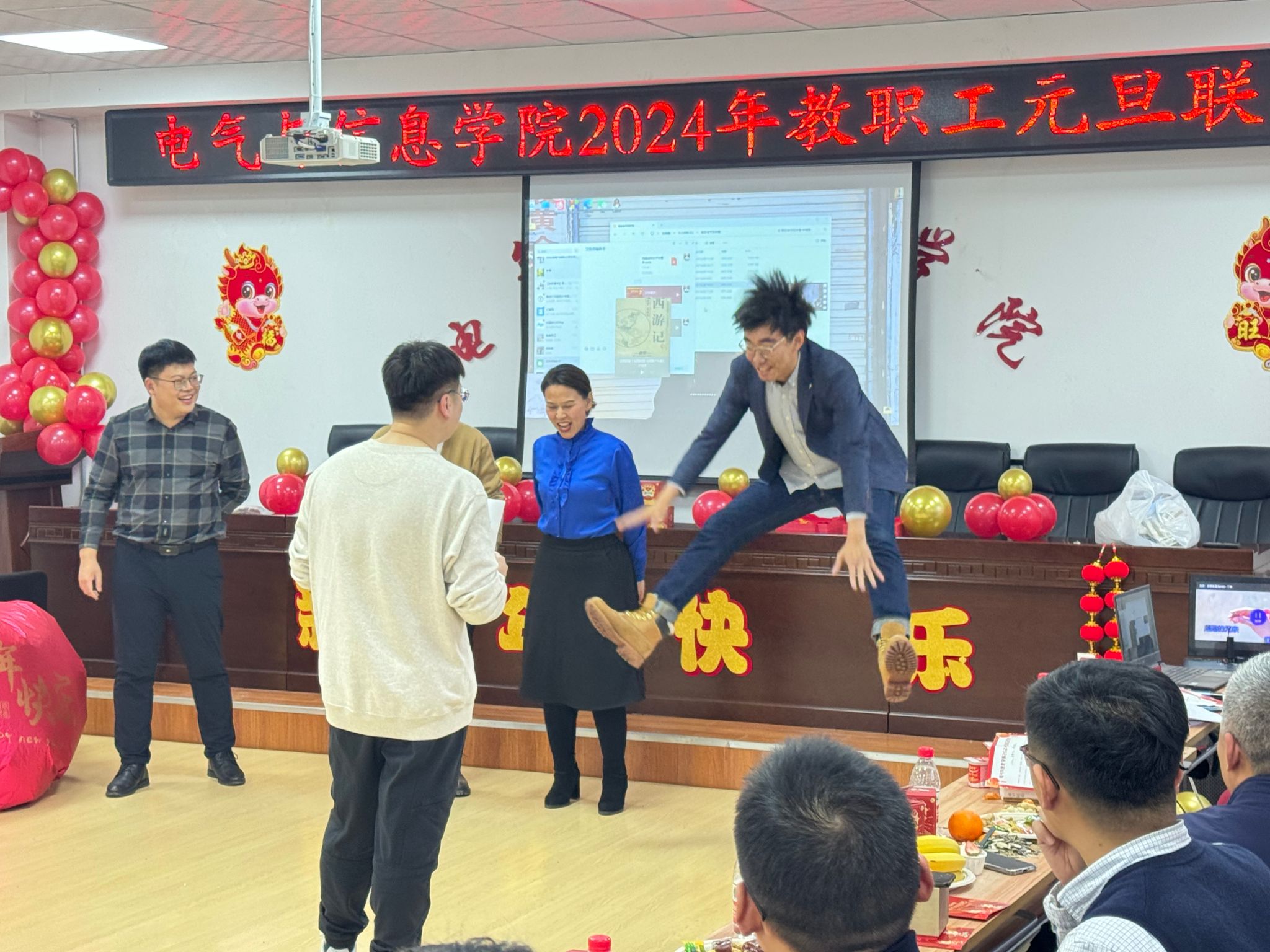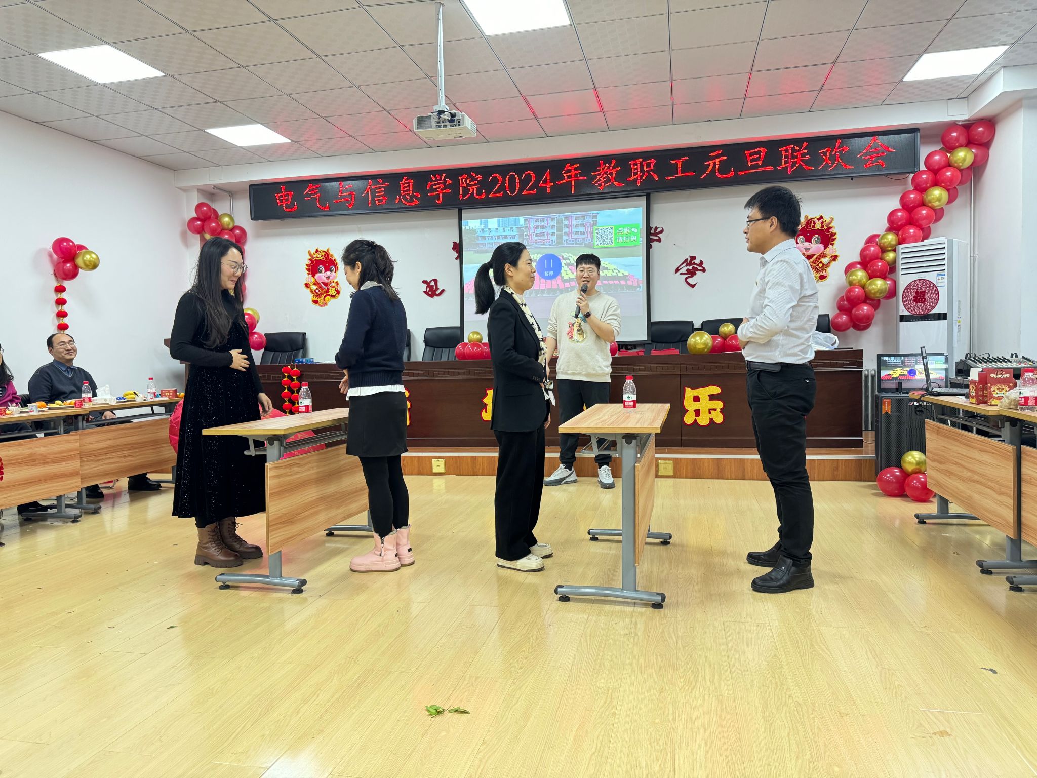 流光溢彩辞旧岁,欢歌笑语迎新年,为庆祝2024年元旦佳节,营造欢乐、祥和的节日氛围,充分展现学院教工团结奋进、昂扬向上的精神风貌,12月29日下午,电气与信息学院在学院530会议室举办了2024年教职工元旦联欢会。学院领导班子成员及全院教职工共聚一堂,联欢会由计算机基础教学部教师王文峰和辅导员乔傲涵主持。