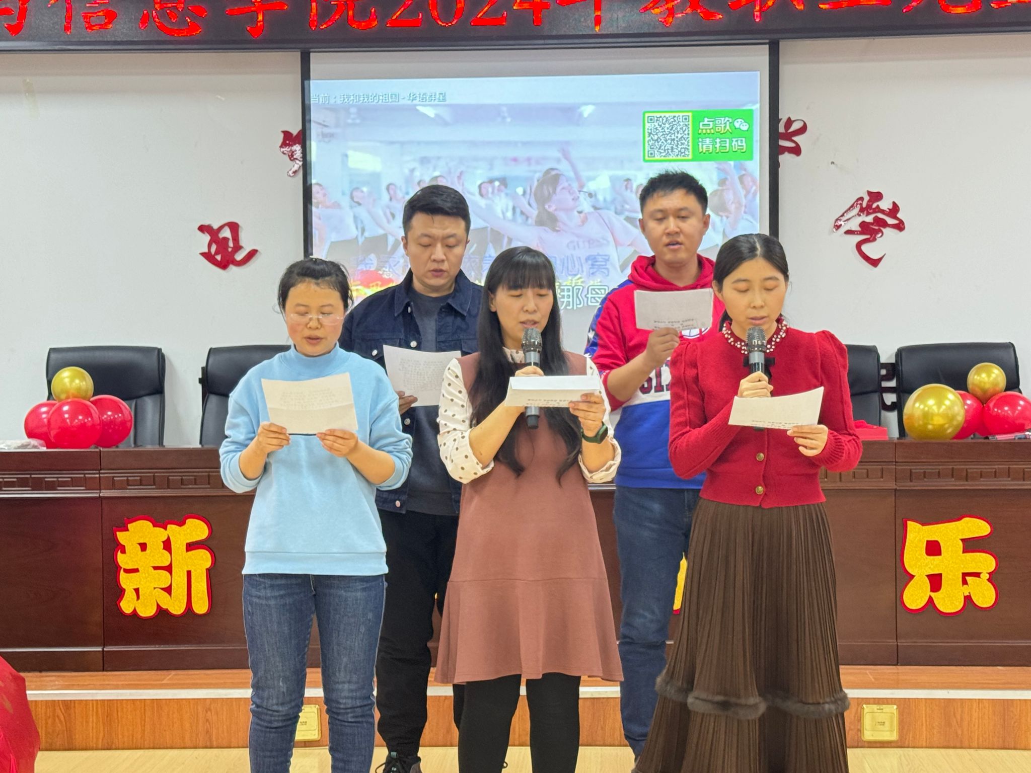 最后,联欢会在周跃佳、黄博妍、张卫丹、李鸿博、刘宇博合唱《我和我的祖国》的幸福欢乐气氛中圆满结束。