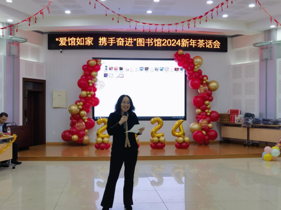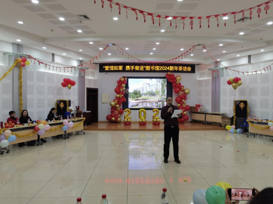 茶话会为全体馆员精心准备了龙年吉祥玩偶和台历作为入场伴手礼,节目期间设有5个游戏环节和1个抽奖环节,大家参与踊跃,现场气氛热烈。图书馆副馆长李巍为服务图书馆40年即将退休的同志颁发了荣誉证书,表彰其为服务师生和推动校园文化事业发展做出的贡献。图书馆馆长赵宝辉用“甩掉疲惫辞旧岁,放歌起舞展风采;踔厉奋发迎新春,擂鼓击乐抒情怀”对茶话会进行了总结,并提出新的一年,图书馆要在精细化、精准化上下功夫,坚决做好馆舍环境升级后的可持续维护和文化氛围的营造,在智慧图书馆建设的背景下,以科技、数据赋能充分服务好学校世界一流学科和省高水平大学建设。