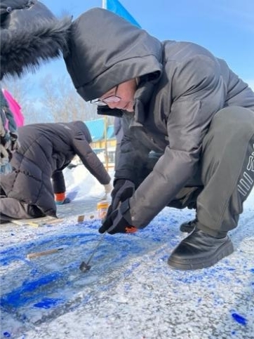开幕式现场,艺术学院师生在近千米的冰面上“以刀代笔,以色铸魂”,创作出24幅生动形象、造型精美的冰版画作品。香坊区画院院长张伟洪及主流媒体对艺术学院师生创作的冰版画作品给予了高度评价。