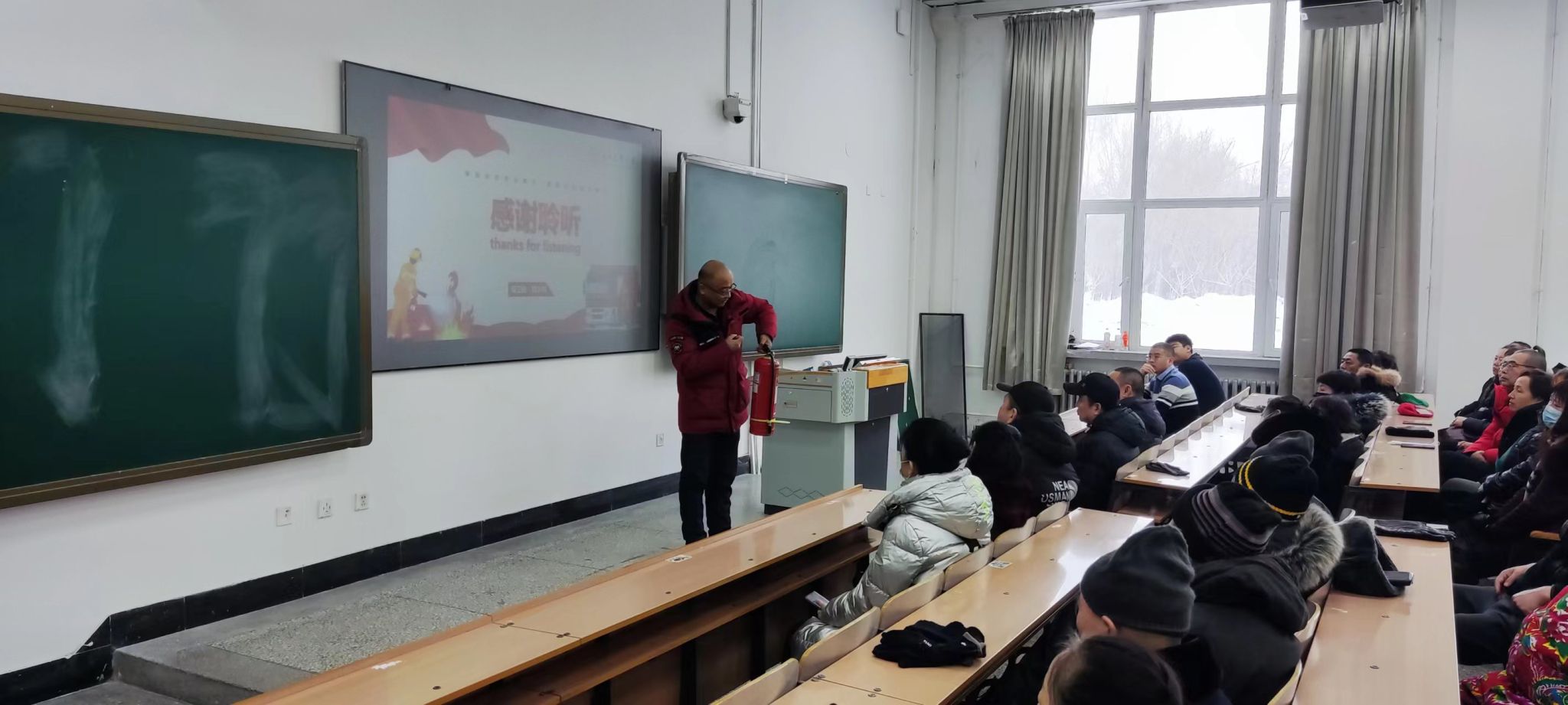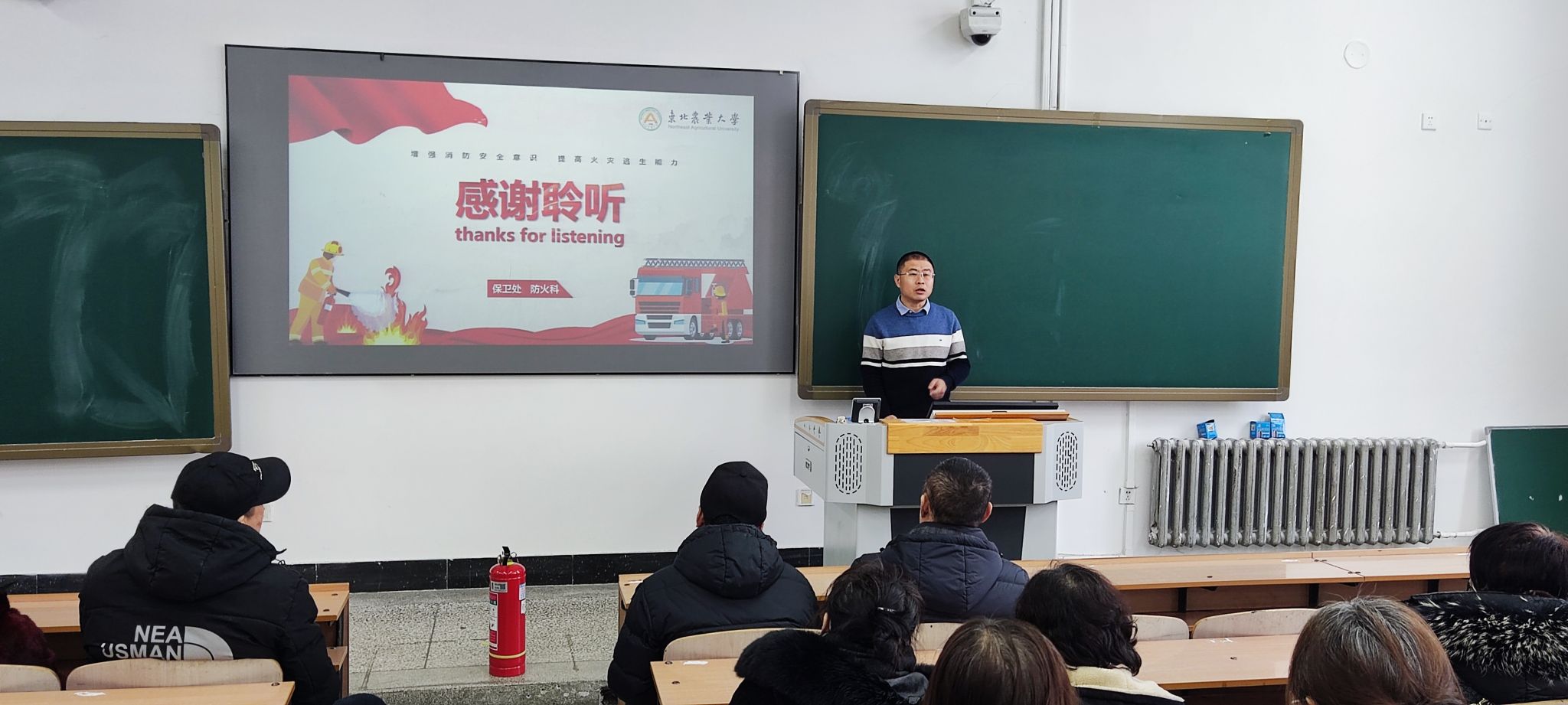 会上,刘宇欣对寒假期间门卫重点工作进行了部署,防火科刘浩东围绕消防基本知识、火灾典型案例、消防器材使用方法、常见火灾预防四个方面进行了培训,并针对“四懂四会”基本消防安全常识进行了详细的讲解。防火科杜波为大家现场讲解了灭火器及消火栓的使用方法,以及在扑灭初起火灾时应注意的安全事项。