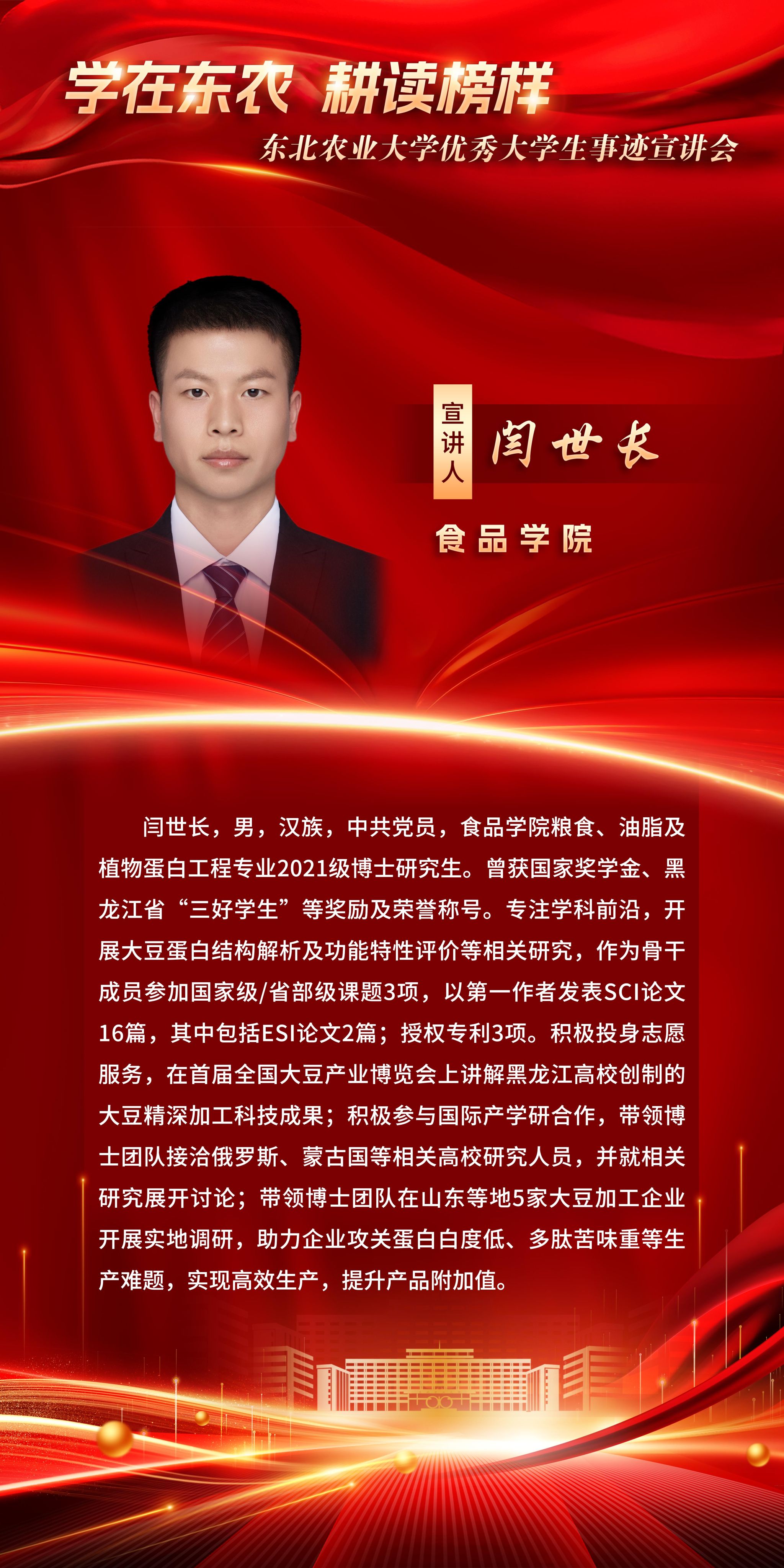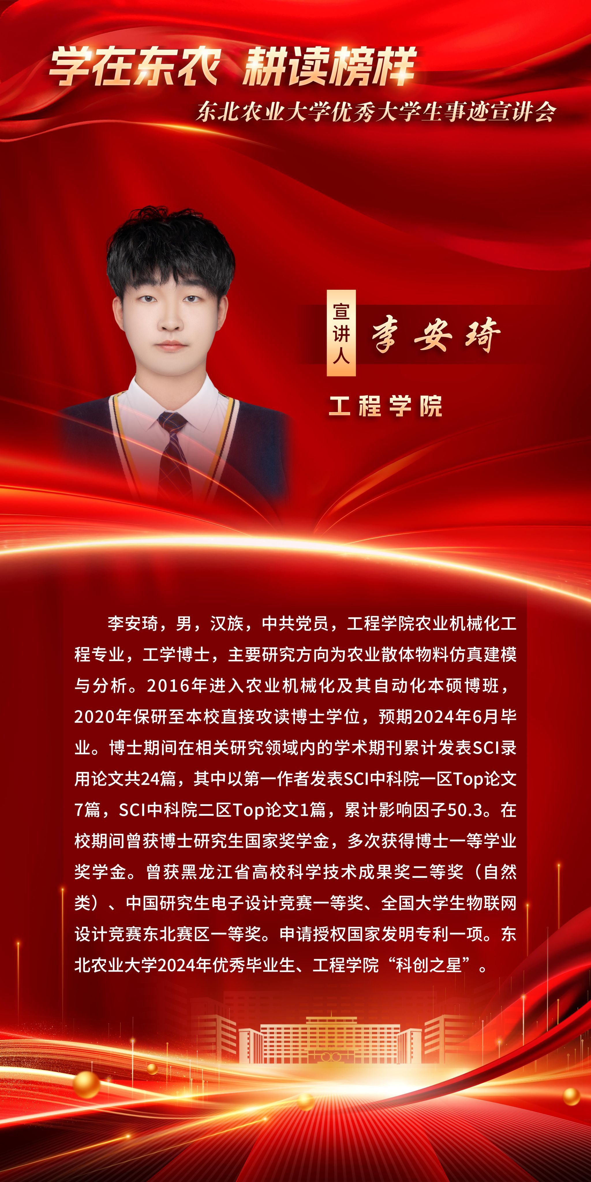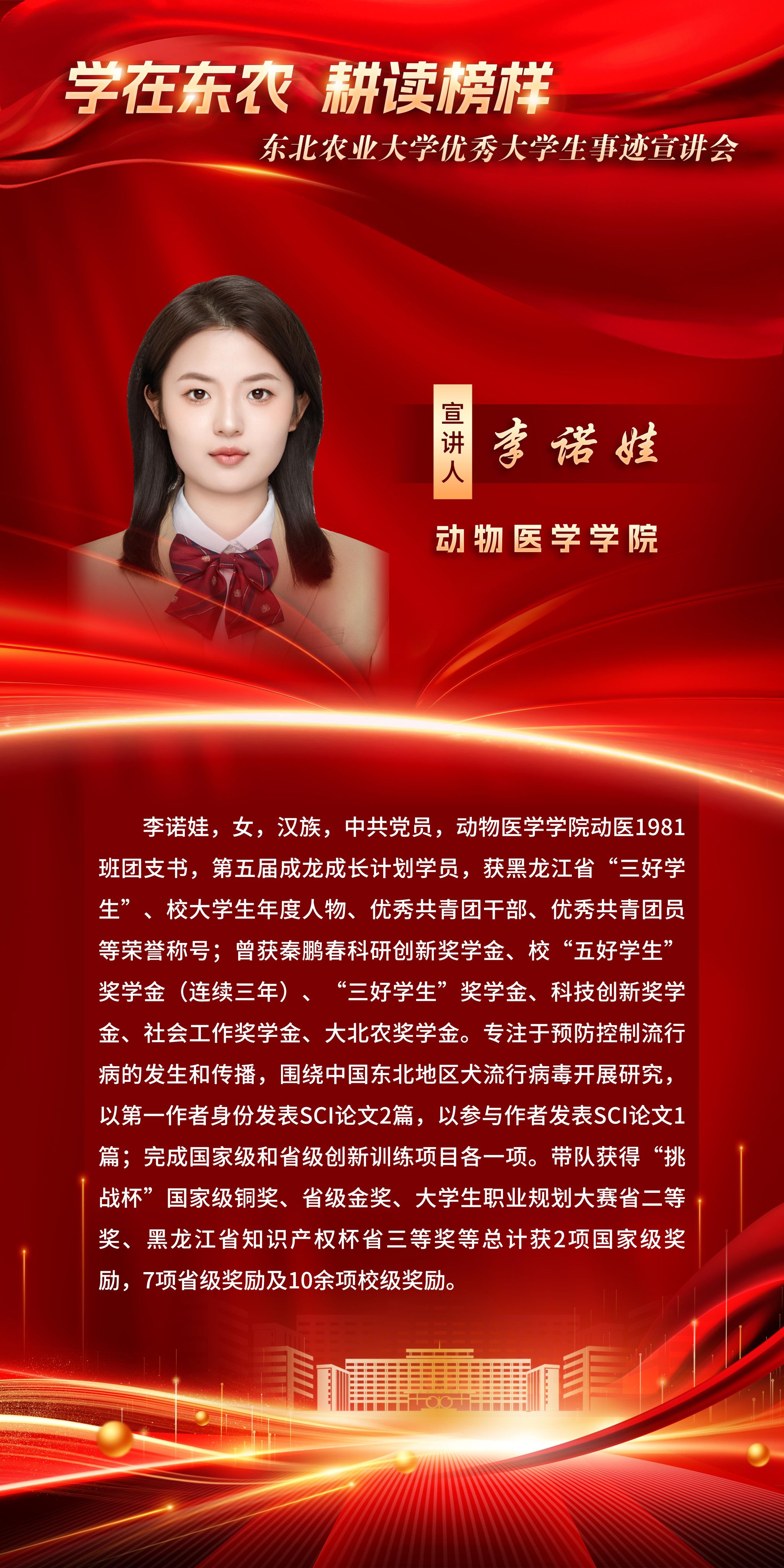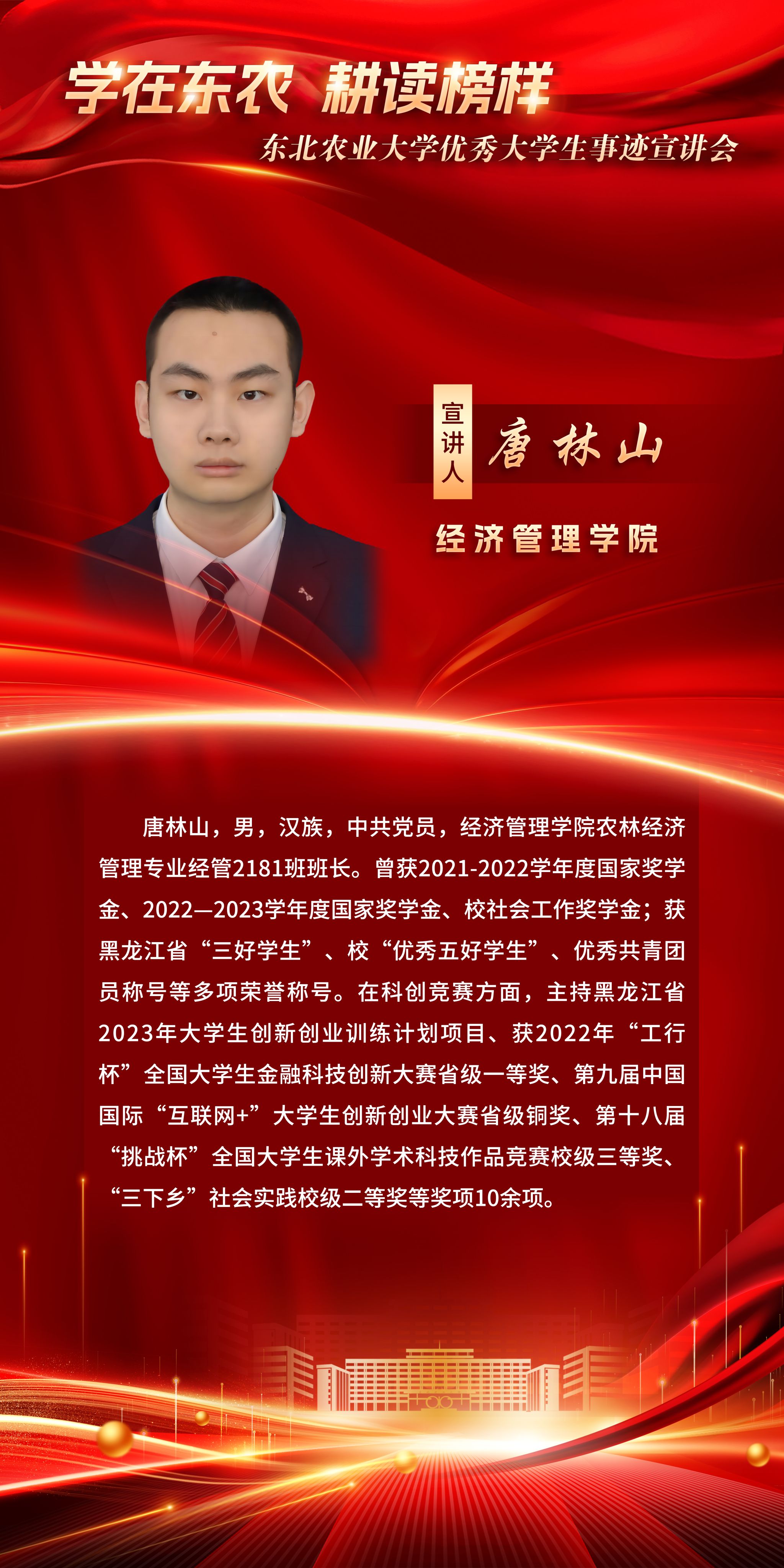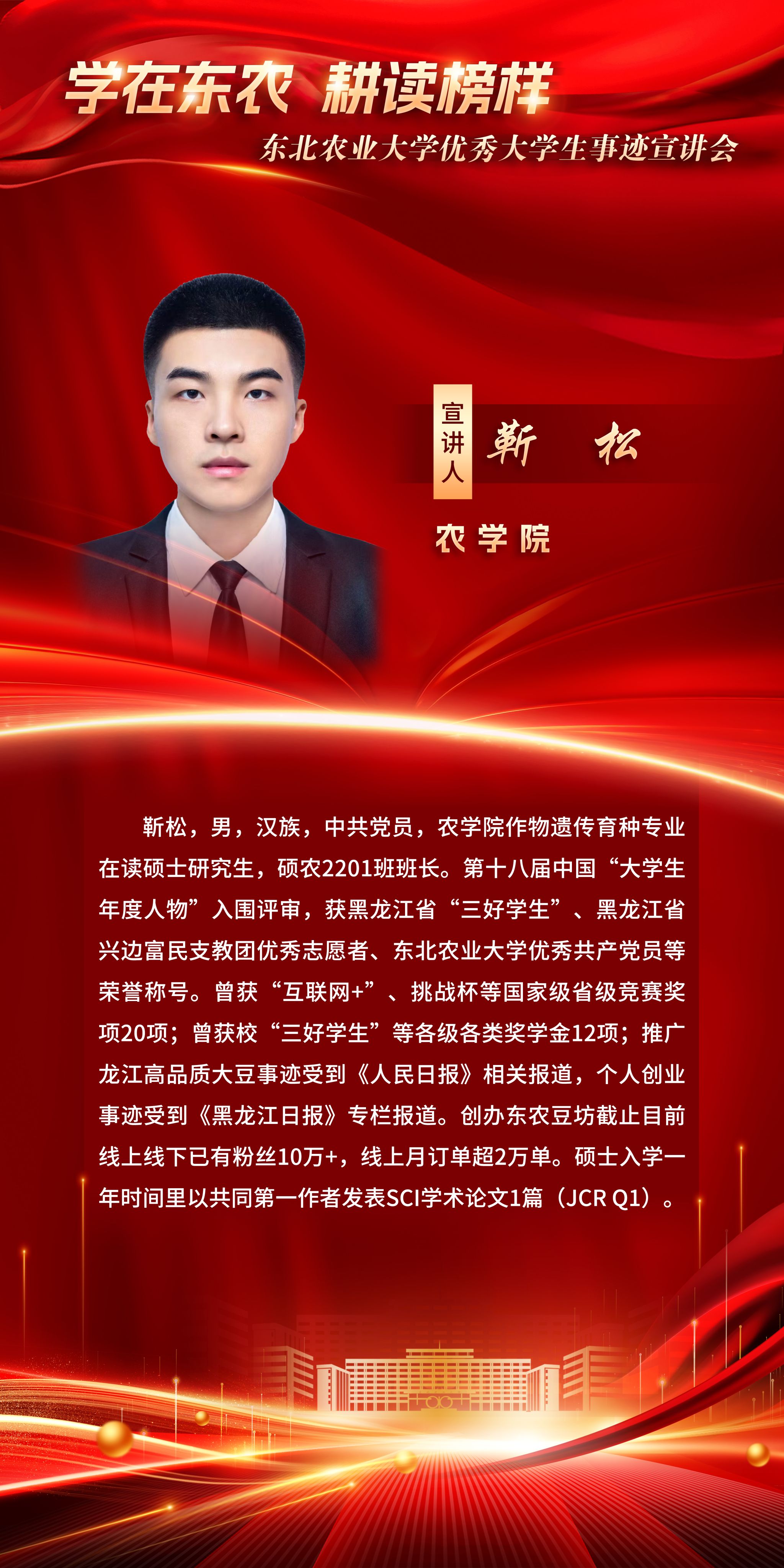 为全面贯彻党的教育方针,落实立德树人根本任务,充分发挥学生榜样的示范引领作用,营造积极向上的学习氛围,激发东农学子当好主人翁、建功新时代的拼搏热情,激励全体学生努力成长为全面发展的知农爱农新型人才,学生工作部、校团委联合召开“学在东农 耕读榜样”优秀大学生事迹宣讲会,现将有关事宜通知如下: