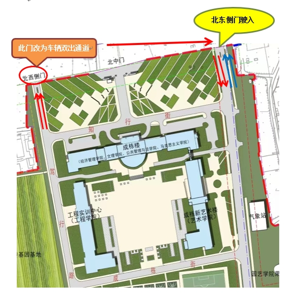 为改善我校交通环境,提高门岗通行效率,经学校研究决定:自7月15日起,学校北西侧门行车通道由原“单进单出”调整为“双出”通道,由长江路进入校园的车辆,请从北东侧门岗驶入。