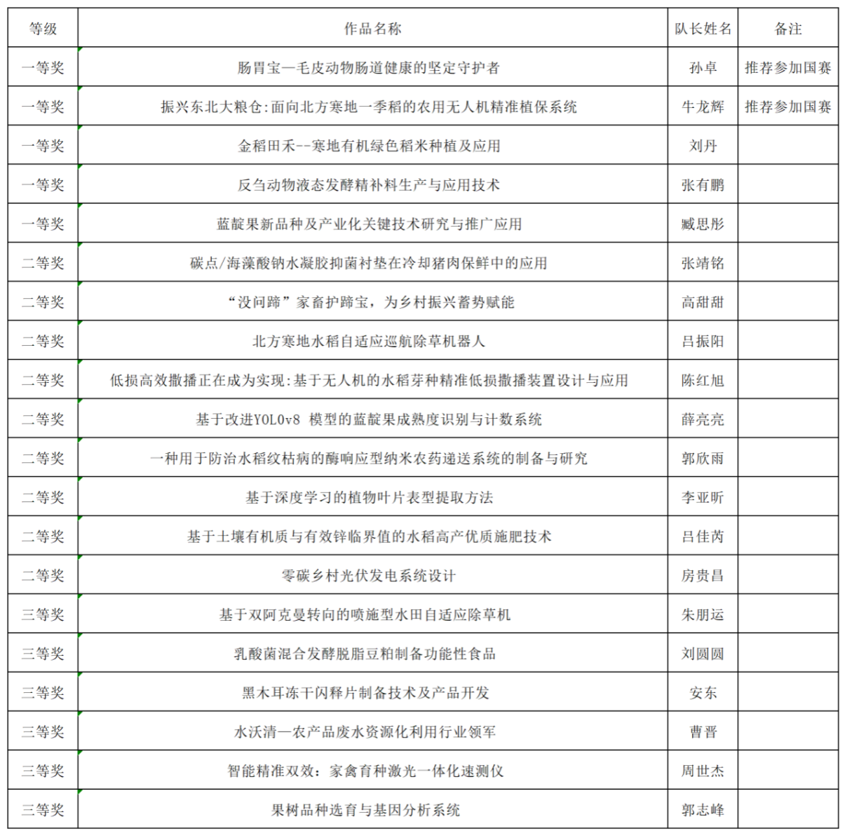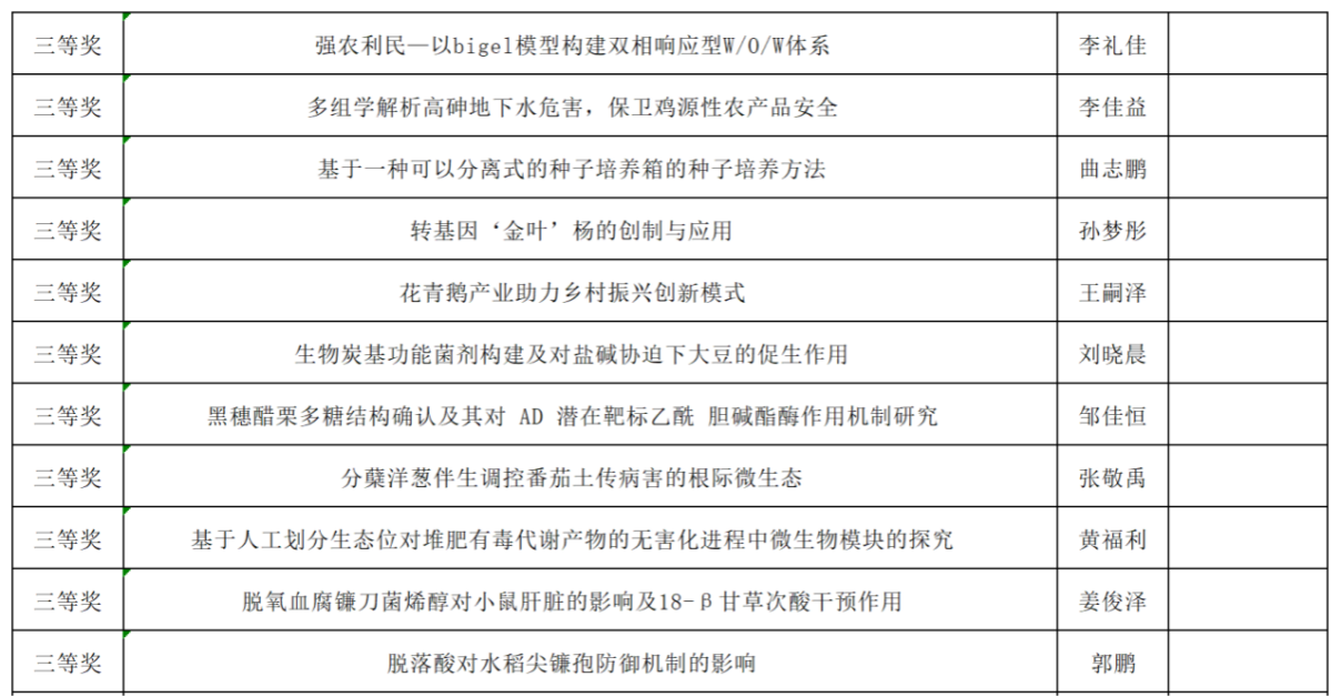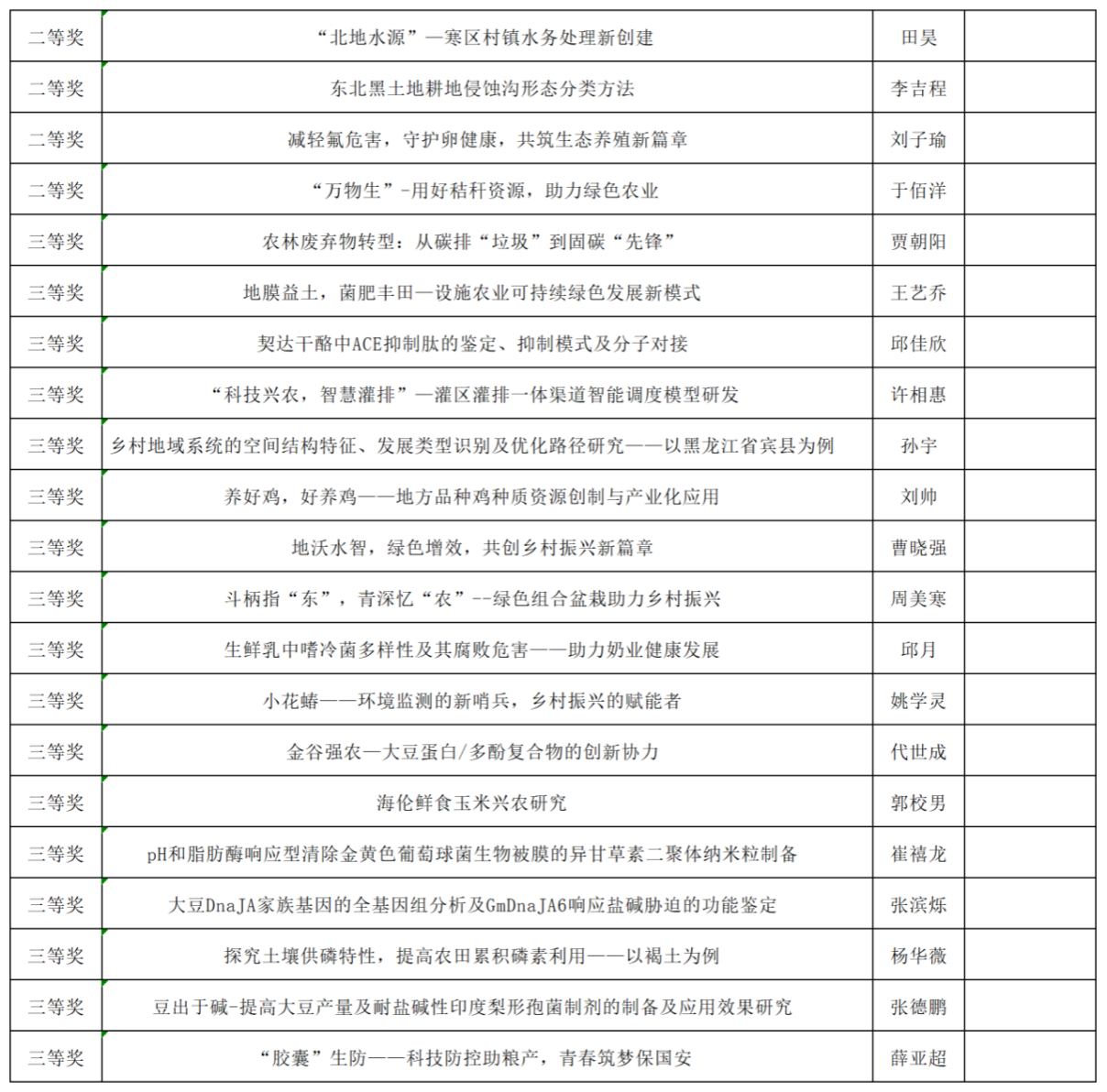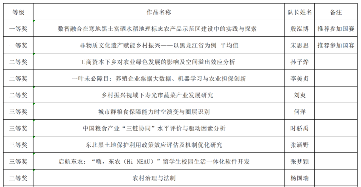 8月6日上午,2024年中国研究生乡村振兴科技强农+创新大赛第四届科技作品竞赛东北农业大学校内选拔赛工作落下帷幕。经学院审核推荐、校赛初评、校赛决赛等三个阶段,学校共有来自15个学院的82支队伍被推荐入围参加校内选拔赛。通过专家评审委员会综合评议、学校竞赛组委会审核,自然科学类、社会科学类、科技发明制作类等三个赛道共评选出一等奖15名、二等奖28名、三等奖39项,同时各赛道按评审成绩遴选出9支队伍晋级参加国家竞赛。现将获奖作品公示如下: