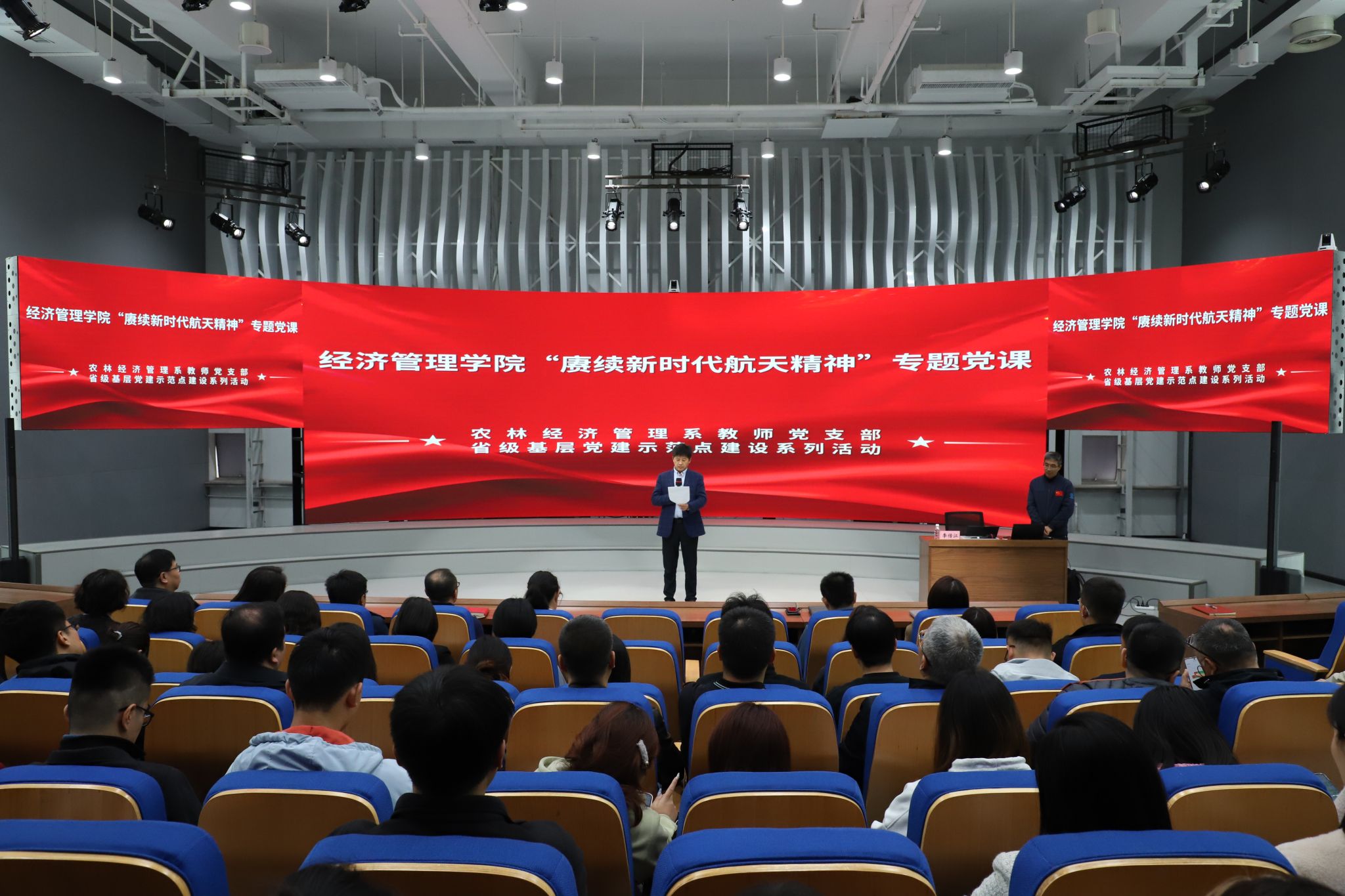为使广大师生深入了解新中国成立以来我国航天事业取得的伟大成就,大力弘扬科学家精神,培养党员教师的担当精神和奉献情怀,10月16日,经济管理学院邀请哈尔滨工业大学航天学院李传江教授为学院师生作了一场关于赓续新时代航天精神的专题党课。此次活动也是农林经济管理系教师党支部省级基层党建示范点建设系列活动之一。经济管理学院党委书记王洪亮、党委副书记高天琦、副院长李大为、王刚毅、王洋、学院全体教师党员及学生党员代表参会,王洪亮主持专题党课。