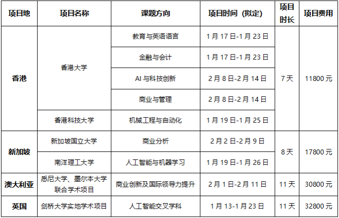 本次寒假交流项目以线下形式进行,交流院校为香港大学、香港科技大学、新加坡国立大学、南洋理工大学、悉尼大学、墨尔本大学联合实地项目、剑桥大学,交流领域涵盖理、商、传媒、金融,教育等专业,项目报名不限制专业。