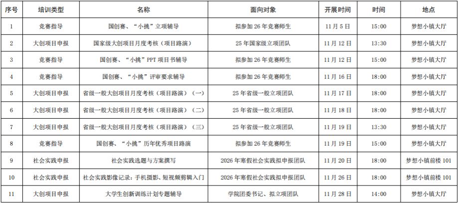 为全面贯彻落实党的教育方针,根据《教育强国规划纲要(2024-2035)》和《国务院办公厅关于进一步支持大学生创新创业的指导意见》(国办发〔2021〕35号)的总体部署,推动我校学生创新实践活动深入开展,激发学生创新热情,提升实践能力,校团委(创新创业中心)现将11月(5日至28日)即将开展的创新创业实训和专项辅导活动安排发布如下,欢迎有意愿参与大创项目、A类竞赛、社会实践的广大师生踊跃参加!