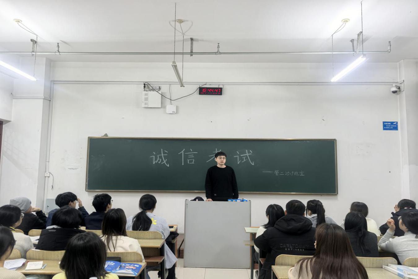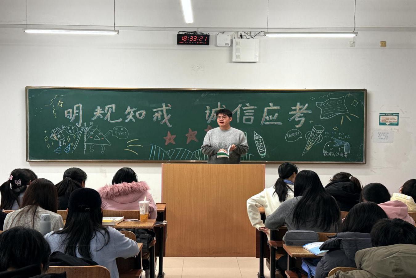 各班级积极响应学院部署,将诚信教育融入日常管理与班风建设。辅导员老师通过主题班会、学习研讨、经验讨论等形式,组织学生深入学习诚信承诺书内容,明确考试纪律与行为准则。班委牵头梳理考试注意事项,提醒学生规范应考流程,将诚信教育融入考前准备各环节,切实筑牢班级诚信应考思想防线。班级内部逐步形成“守诺为先、互信为基、笃行为要”的良好氛围,推动学生诚信理念蔚然成风,学风考风持续向好。
