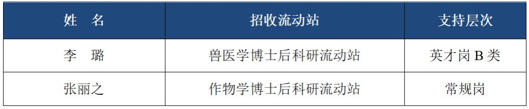 根据《东北农业大学全职博士后支持计划实施办法》(东农人字〔2025〕28号)的有关规定和要求,学校近期开展了2026年第一批全职博士后招收工作,经个人申请、培养及设站学院遴选推荐、人事处审核,由学校2026年第1次人才工作委员会审议,2026年第2次校长办公会、4届26次校党委常委会审议通过,2026年第一批全职博士后招收共有2人符合进站条件,现将人员名单及支持层次予以公示: