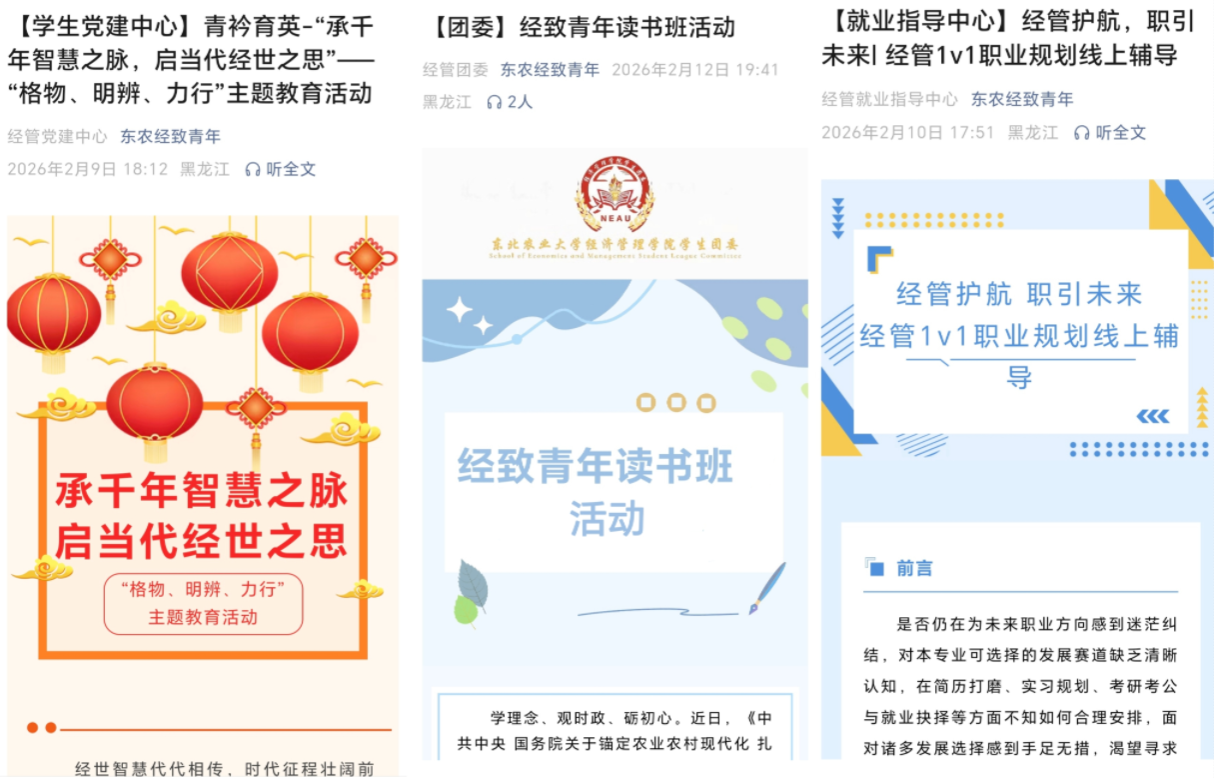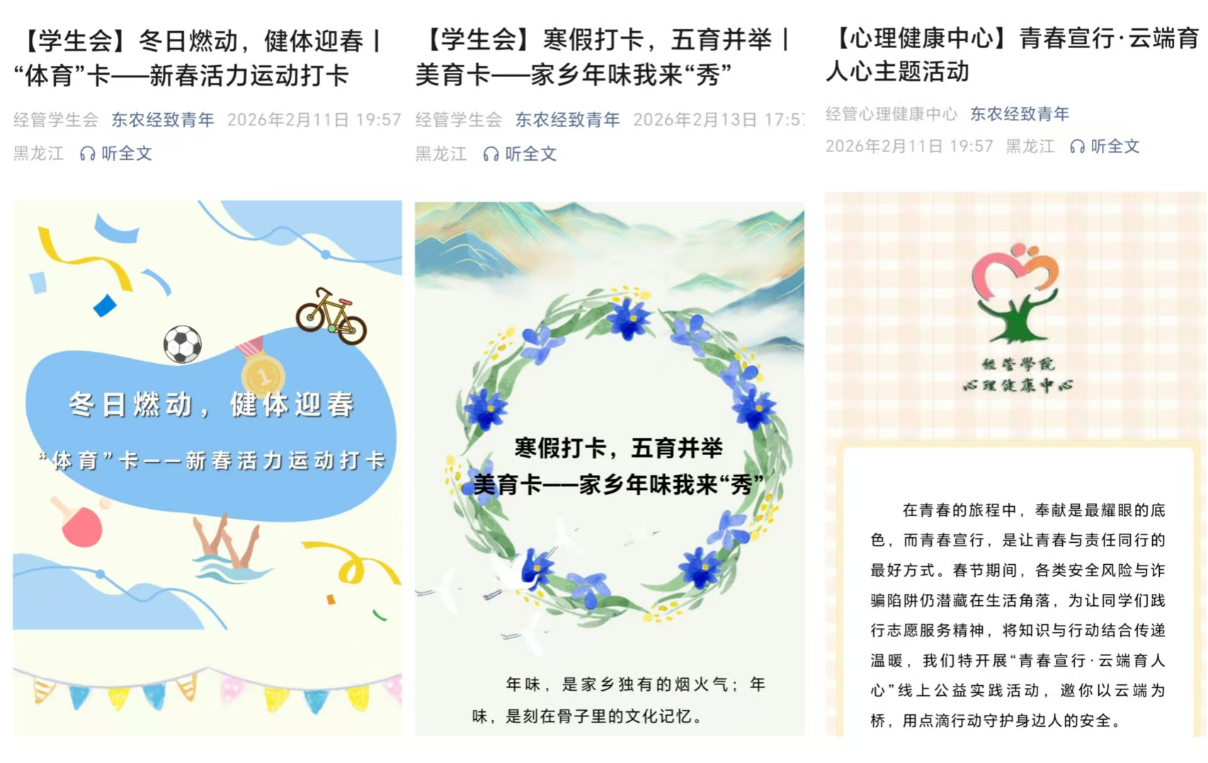 学院以各类学生组织为依托,将家校协同与学生假期特色活动深度融合,让学院的关怀通过多样活动延伸至学生假期成长各方面。学生会开展“五育打卡”系列云端互动特色活动,引导学生合理规划假期生活;学生党建中心开展“格物,明辨,力行”主题教育活动,以传统文脉与党员事迹砥砺学子初心;心理健康中心举办“青春宣行·云端育人心”云端活动,指导学生筑牢假期安全与心理防线;学生团委开设经致青年读书班,云端解读乡村振兴政策,厚植学子知农爱农、服务家国的情怀;青年传媒中心运用AI技术制作“骏马踏春来,经管谱华章”新春祝福视频,展现学院朝气蓬勃、锐意进取的精神风貌。