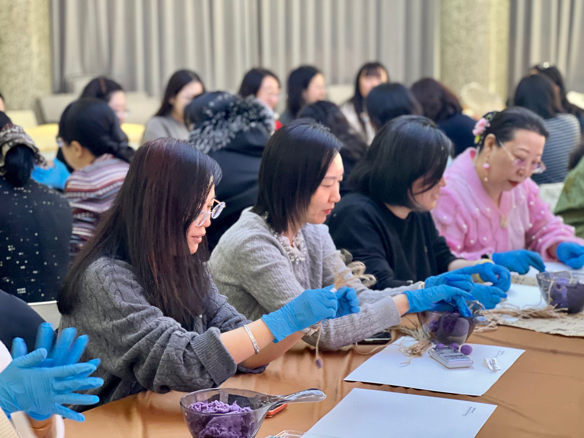 活动现场,桌面上整齐摆放着绿、紫皂基、清香精油,以及一束束麻绳,静静等待着女教工们用巧手赋予它们新的生命。在指导老师细致入微地讲解下,大家认真学习了手工皂的制作要领,从每一颗葡萄的精心称量,到指尖揉捏间的造型塑形,再到将一颗颗莹润的皂果串联成串,在指尖流转间塑造出一颗颗形态逼真、晶莹剔透的“葡萄”。