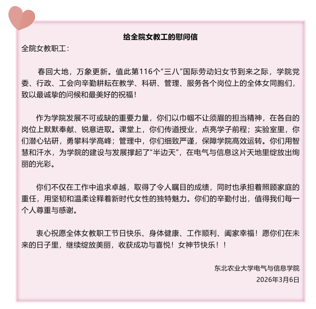 据悉,节日前夕,学院发布了《致全体女教职工的一封信》,以此慰问全体女教职工,并感谢他们在教学、科研及各项工作中发挥的积极作用和作出的重要贡献。