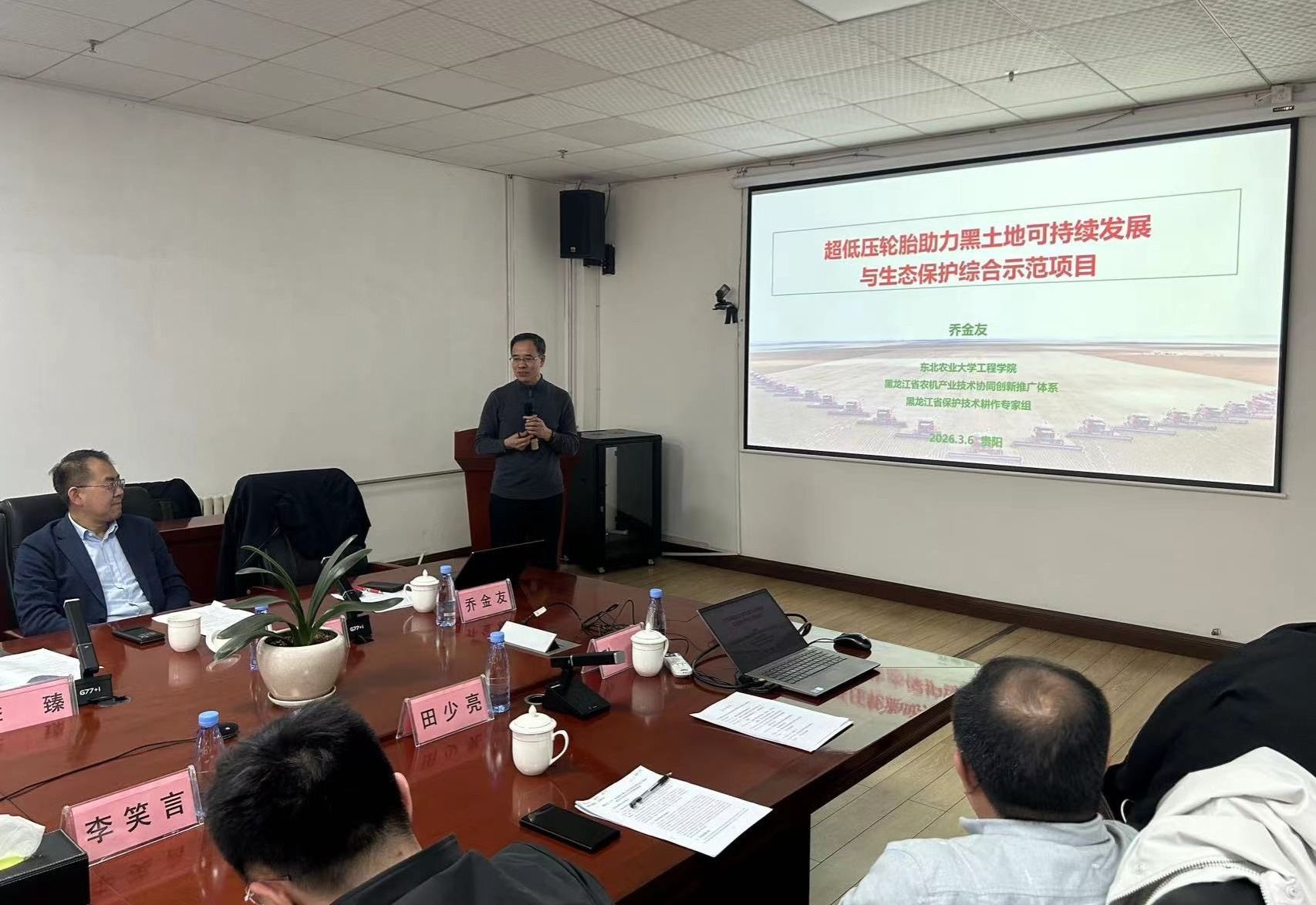 会上,李岩介绍了我校的发展历程、办学特色及科研实力,重点介绍了近年来工程学院在人才培养、学科建设、科学研究、社会服务等方面取得的成绩,强调在农业机械化生产与管理方面具有深厚的底蕴,期待与相关单位在科学研究、人才培养等方面开展深入的合作交流,以充分发挥各自优势,实现共赢。乔金友汇报了项目的实施背景、研究内容规划、实施方案及预期成果等内容。明确实施此项目成果不仅助力超低压子午线轮胎研发和推广应用,还可以有效提升农业机组的动力经济性、减轻黑土机械压实和炭排放,在提升现代农业新质生产力、推动农业机械化与生态保护协同发展等方面有重要意义。
