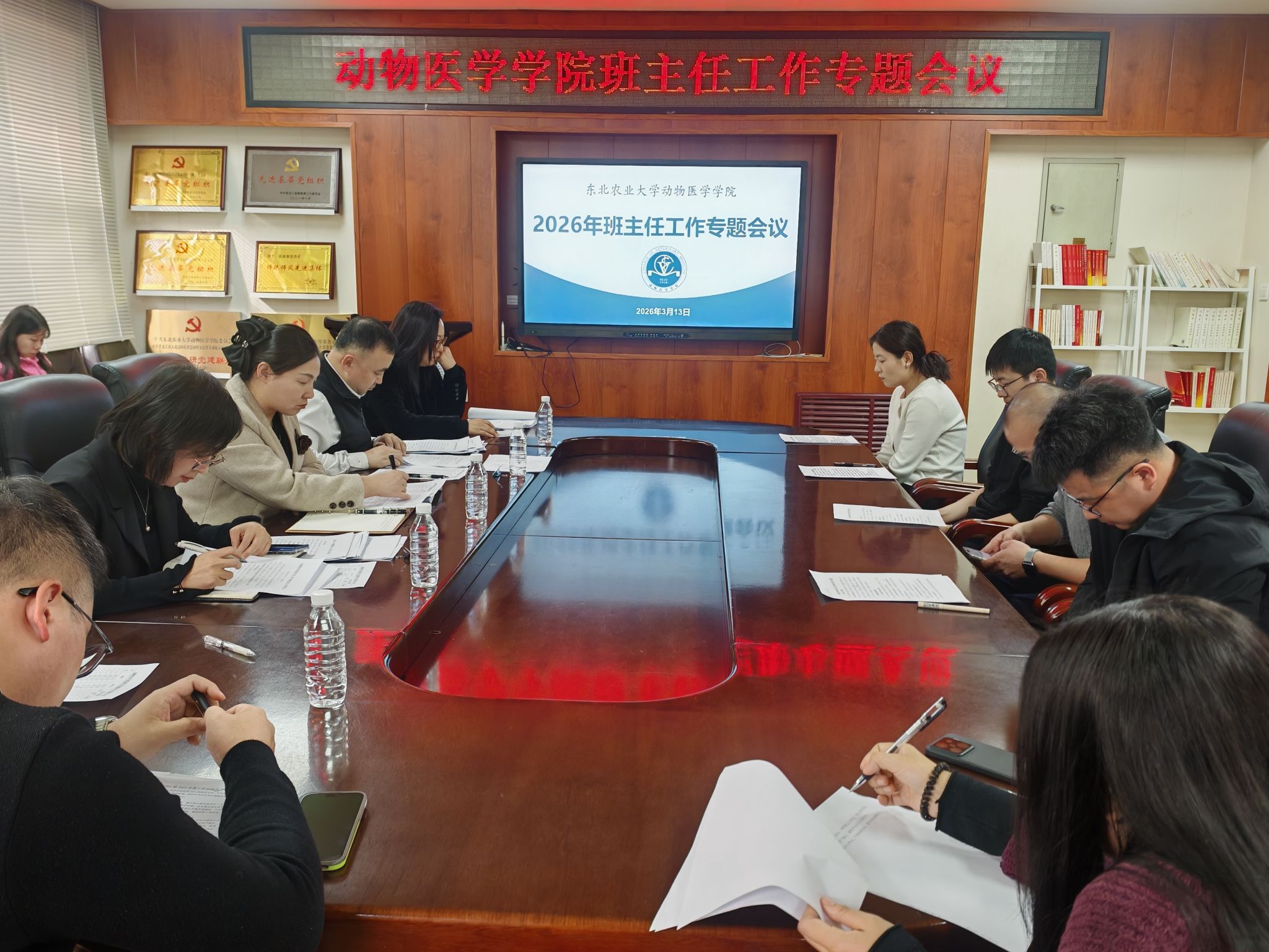 3月13日下午,动物医学学院召开2026年班主任工作专题会议,深入贯彻立德树人根本要求,全面部署新时期班主任队伍建设与育人工作重点任务,夯实学院人才培养根基。学院党委书记张春燕、院长李金龙、党委副书记张鑫琳、副院长张子威、副院长乔薪瑗、全体辅导员及班主任参加会议。会议由张鑫琳主持。