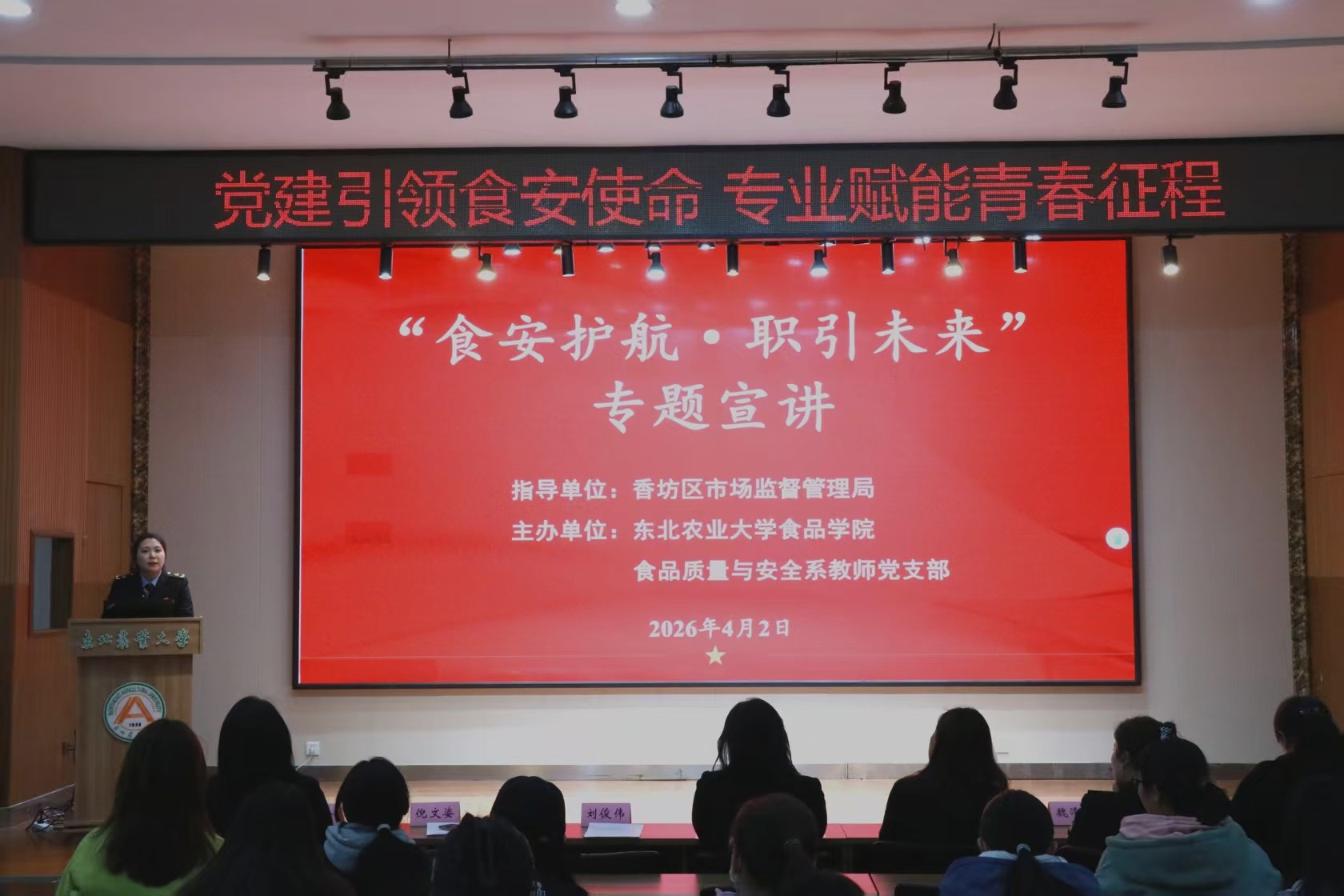 近日,食品学院与香坊区市场监督管理局联合主办的“食安护航·职引未来”专题宣讲活动在音乐厅109举行。