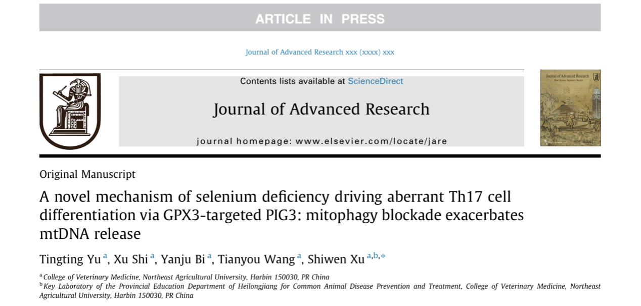 团队在《Journal of Advanced Research》期刊在线发表题为“A novel mechanism of selenium deficiency driving aberrant Th17 cell differentiation via GPX3-targeted PIG3: mitophagy blockade exacerbates mtDNA release”的研究论文。第一作者余挺挺,通讯作者徐世文。