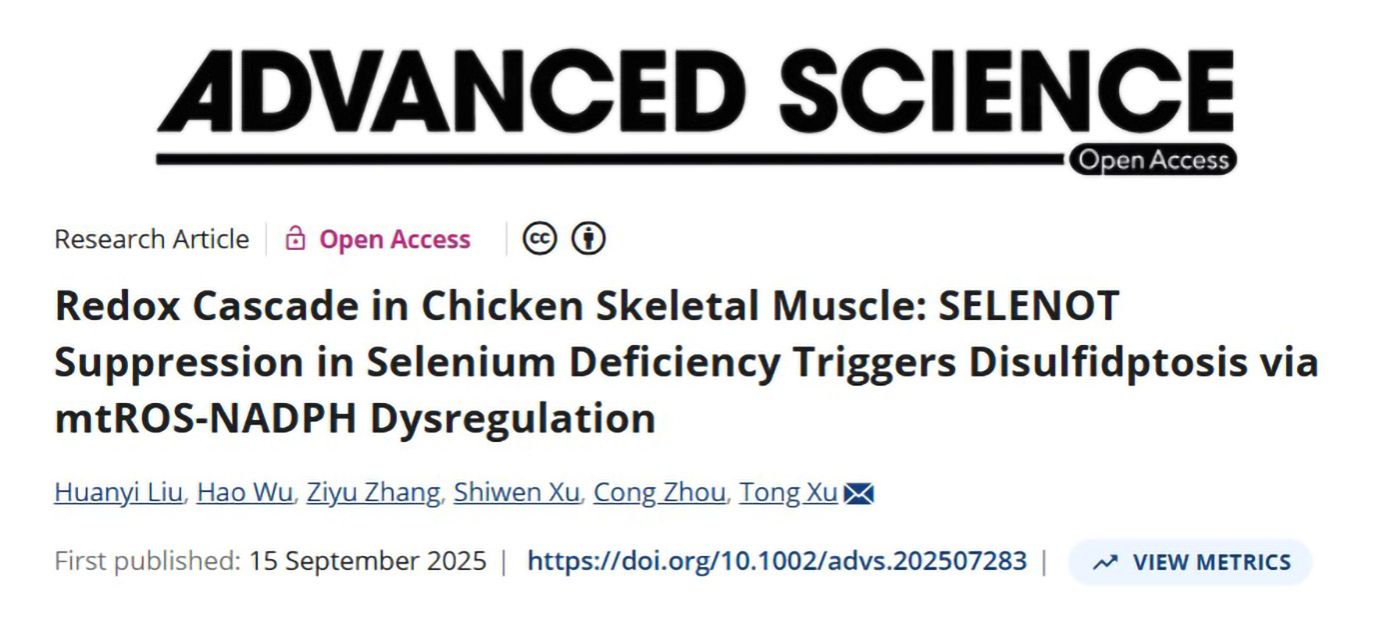团队在《Advanced Science》期刊在线发表题为“Redox Cascade in Chicken Skeletal Muscle: SELENOT Suppression in Selenium Deficiency Triggers Disulfidptosis via mtROS-NADPH Dysregulation”的研究论文。第一作者刘欢逸,通讯作者徐童。