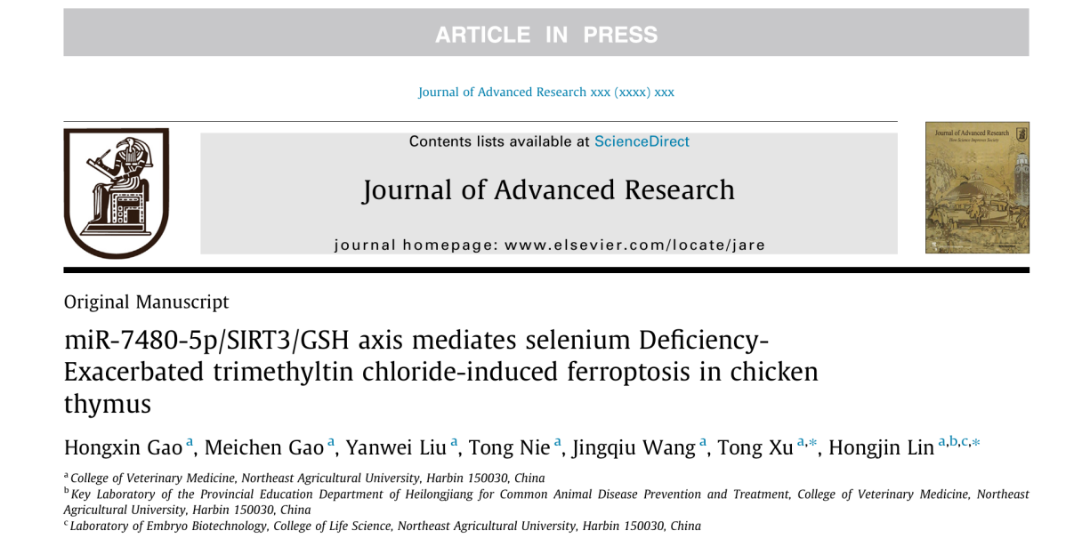团队同期在《Journal of Advanced Research》期刊在线发表题为“miR-7480-5p/SIRT3/GSH Axis Mediates Selenium Deficiency-Exacerbated Trimethyltin Chloride-Induced Ferroptosis in Chicken Thymus”的研究论文。第一作者高红鑫,通讯作者林洪金、徐童。