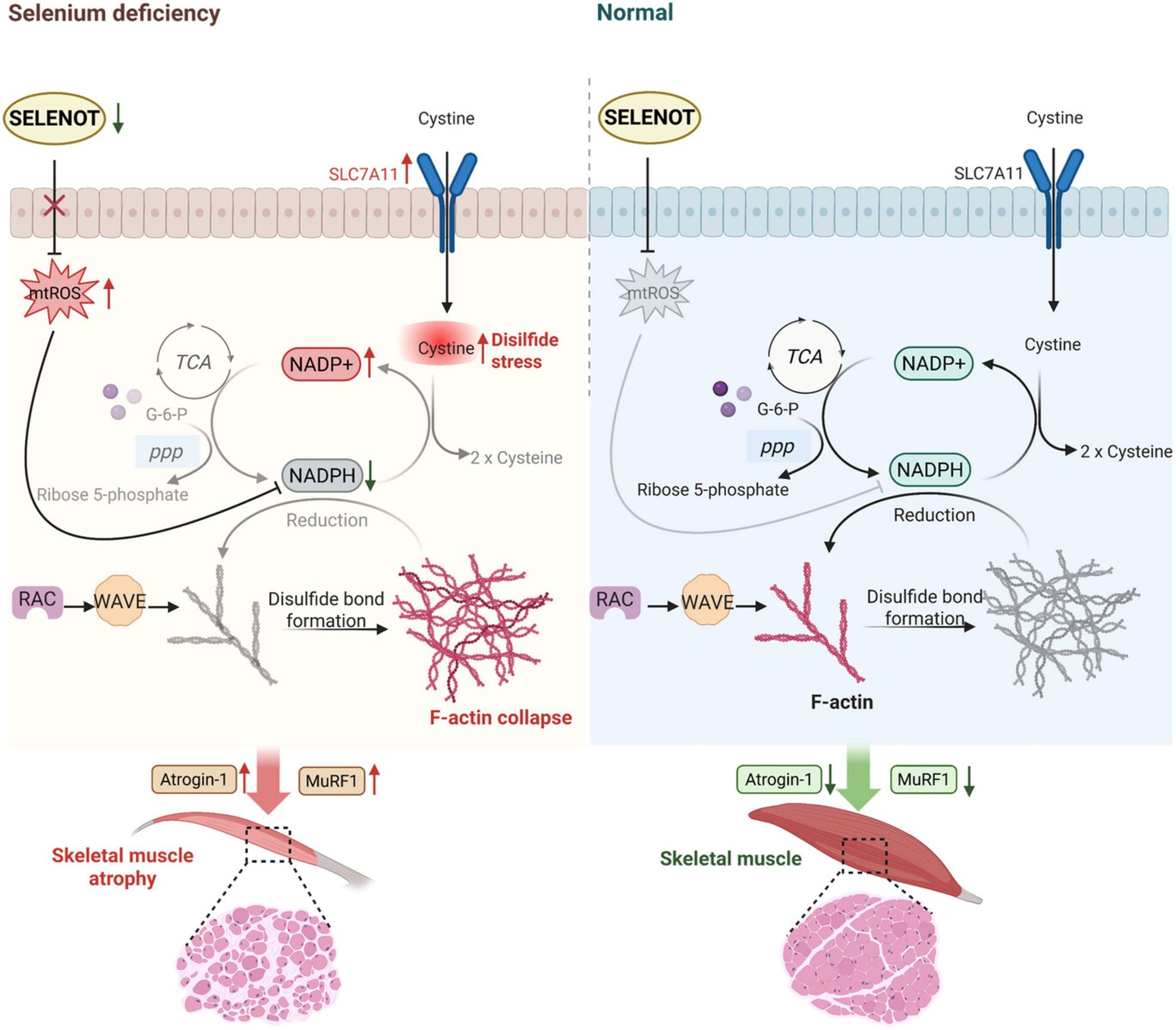 研究团队通过构建硒缺乏鸡模型和原代鸡骨骼肌细胞,综合运用转录组学、蛋白质组学、免疫荧光和分子生物学技术,系统揭示了SELENOT在调控骨骼肌双硫死亡中的关键作用。SELENOT缺乏损害线粒体呼吸链功能,导致线粒体活性氧(mtROS)过量产生、葡萄糖代谢重编程以及NADPH代谢紊乱。这些变化引起胱氨酸积累和双硫死亡,进而导致肌动蛋白二硫键异常结合。研究证实,TEMPO介导的mtROS抑制或补充 NADPH可部分逆转硒缺乏诱导的肌肉萎缩。SELENOT过表达能够有效缓解硒缺乏细胞中的氧化还原失衡、NADPH功能障碍、双硫死亡和肌管萎缩,而Rotenone诱导的mtROS激活或抑制NADPH的合成则逆转这些保护效应。