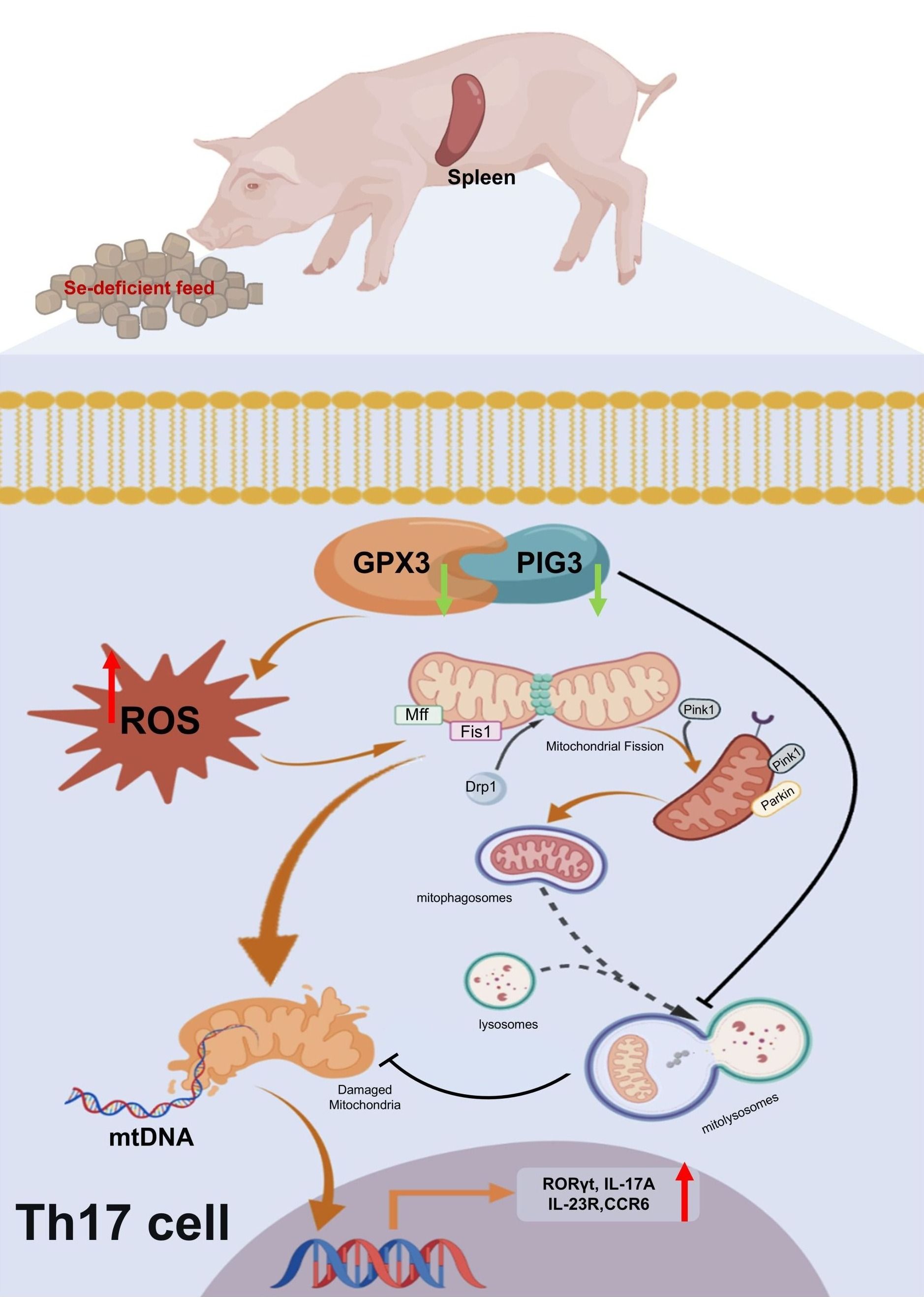 研究团队通过系统的体内外实验,发现硒缺乏能够显著下调GPX3蛋白表达并抑制PIG3活性,且GPX3与PIG3存在直接的蛋白互作关系。在动物实验中,硒缺乏通过下调猪脾组织中GPX3及其靶蛋白PIG3的表达,引发氧化还原失衡与线粒体功能障碍,进而导致线粒体融合-分裂失衡及线粒体自噬流受阻。这种自噬阻滞阻止了线粒体DNA(mtDNA)的有效清除,造成mtDNA在胞质内蓄积,并激活cGAS-STING信号通路,最终驱动Th17细胞异常分化。而过表达PIG3则可显著缓解由GPX3敲低引起的线粒体功能障碍,减少mtDNA泄漏并抑制Th17异常分化,且该保护作用严格依赖于完整的线粒体自噬流。由此,研究提出硒缺乏诱导免疫紊乱的核心机制为:通过抑制GPX3/PIG3轴导致线粒体自噬阻滞,加剧mtDNA渗漏,最终形成“线粒体功能障碍→mtDNA释放→Th17分化”的免疫失衡链条。