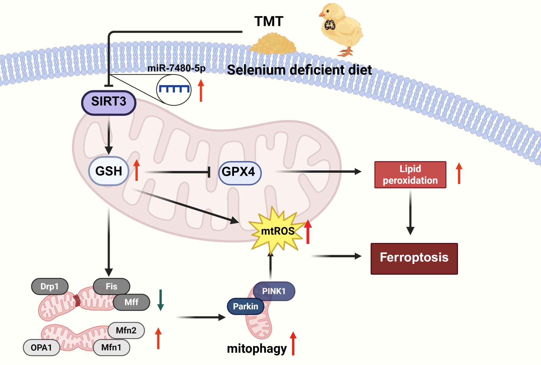 研究团队以AA肉鸡为研究模型,通过体内外实验发现,硒缺乏可显著加剧TMT诱导的胸腺组织结构异常、线粒体氧化应激、线粒体稳态失衡和功能障碍、线粒体自噬及铁死亡。进一步研究发现,线粒体氧化应激及线粒体自噬可调控铁死亡的发生,且硒缺乏与TMT联合暴露所致的损伤程度远高于单一暴露组。研究揭示,miR‑7480‑5p/SIRT3/GSH轴是该过程的核心调控通路:硒缺乏与TMT暴露通过上调miR‑7480‑5p表达来抑制SIRT3,降低还原型谷胱甘肽(GSH)水平并破坏线粒体质量控制,从而诱发线粒体过度自噬与铁死亡,最终导致胸腺免疫功能紊乱。