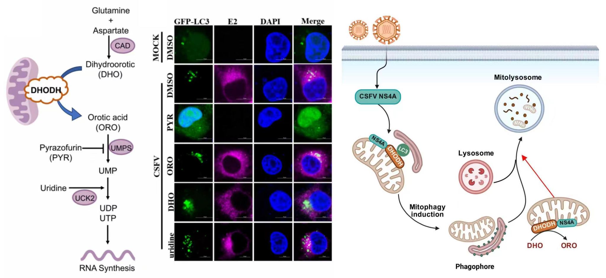 近日,我校周斌教授团队在国际权威期刊《Autophagy》(影响因子14.3,中科院1区TOP期刊)发表了题为“Pestiviruses utilize pyrimidine metabolism to regulate mitophagy for viral replication”的研究论文。该研究系统阐明了二氢乳清酸脱氢酶(DHODH)在动物瘟病毒(CSFV)等黄病毒科病毒复制中的关键调控作用,揭示了病毒通过调控宿主细胞嘧啶代谢-自噬轴促进自身复制的新机制,对新型抗病毒药物的开发具有重要的理论与现实意义。周斌教授和王丽副教授为共同通讯作者。
