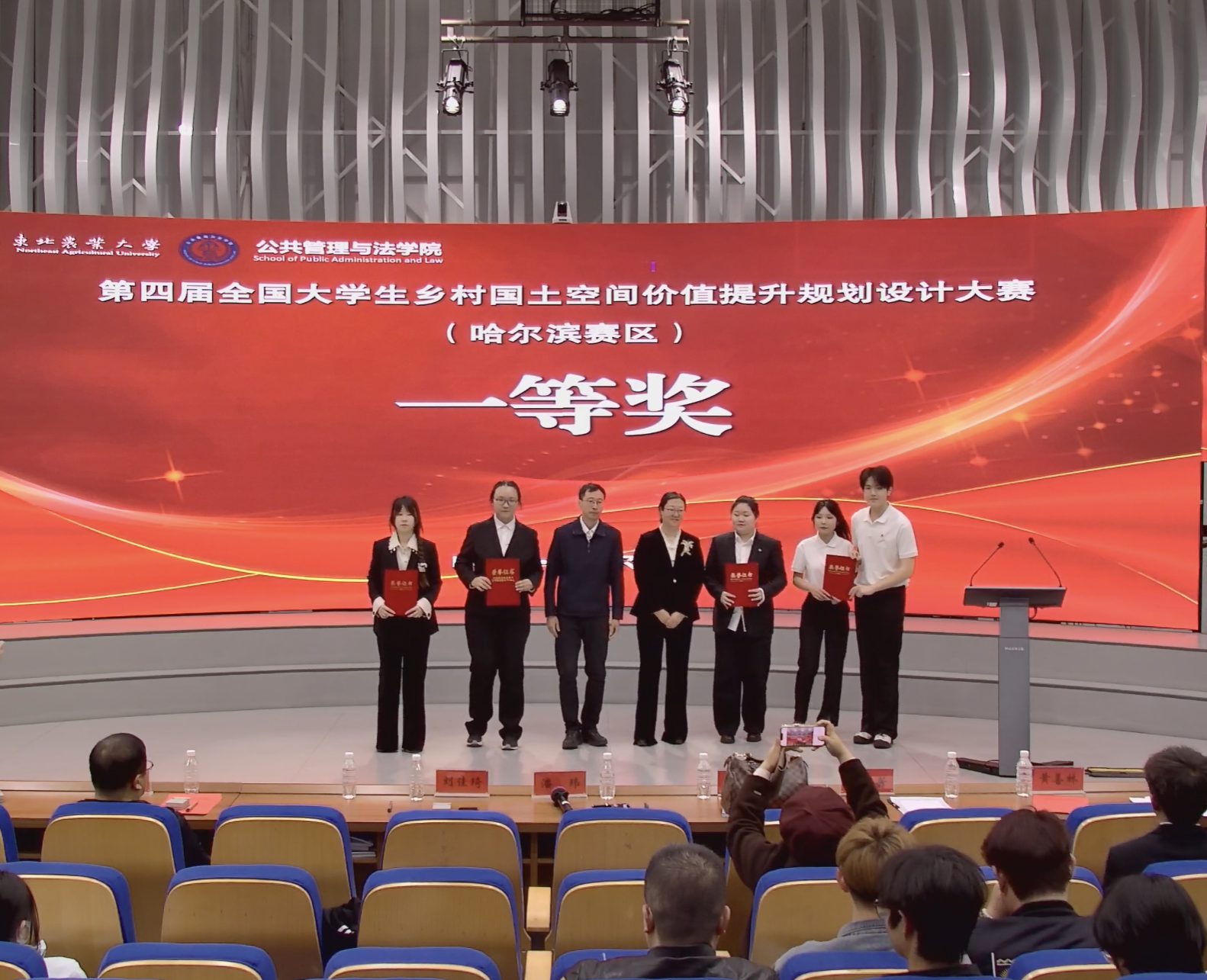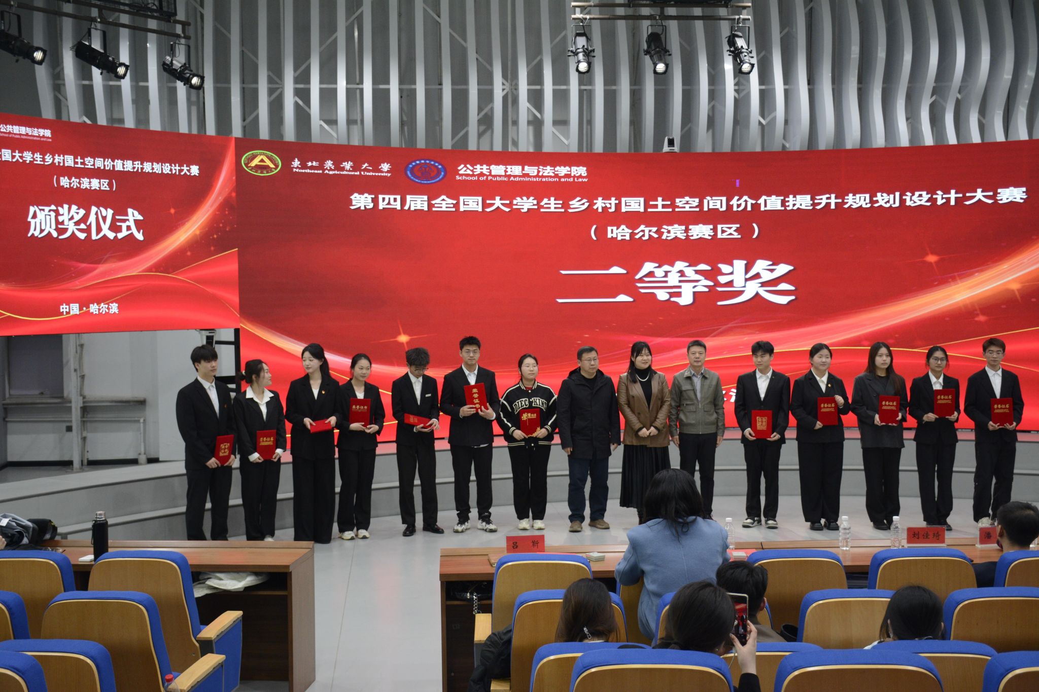 经过激烈的角逐,我校“荪韵家兴队”、东北大学“北隅绘乡队”、哈尔滨师范大学“北国兴乡队”、吉林师范大学“红韵绿行队”荣获哈尔滨赛区一等奖,将代表哈尔滨赛区参加全国总决赛。我校“乡野赋能队”、长春师范大学“经纬筑梦队”、吉林师范大学“绿野智绘团”、东北大学“从容应对队”等12支队伍获得本届大赛二等奖。