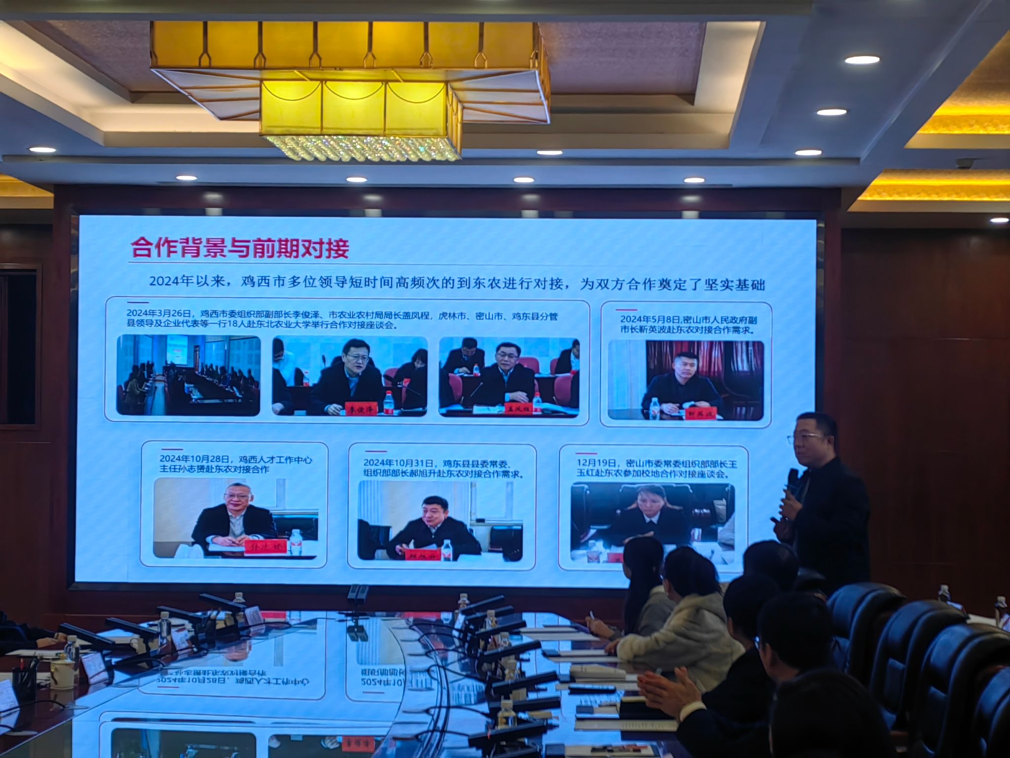 孙世钧向鸡西市委、市政府和各位领导对双方合作的高度重视,以及长期以来对我校的支持帮助表示感谢。他指出,去年11月,双方签署了战略合作协议,开启了校地合作的崭新篇章,明确了推动农业“科技”与“资源”共享,打造乡村“样板”与“示范”共建,促进“人才”与“干部”培养的三大核心任务。他针对下一阶段全面推进合作提出四点要求,一是要充分发挥东农的优良传统。持续深化与地方政府的紧密合作关系,继续务实推进学校社会服务与成果转化工作。二是要推动技术创新向科学研究和地方产业需求两端延伸。以创新牵引技术迭代更新,贯通整个技术链条,形成稳定研究方向。三是要提高各学院对社会服务工作重要性的认识。要结合鸡西市的实际,主动谋划,练好内功,优化运用“基地+中心+产业联盟”的成功模式,推进社会合作与成果转化工作与科研工作和学科建设的深度契合。四是要转换身份定位,认真梳理技术需求。要把鸡西市农业农村现代化建设当作自己事,和鸡西市共同努力把双方合作共建做得更实、更深、更好。