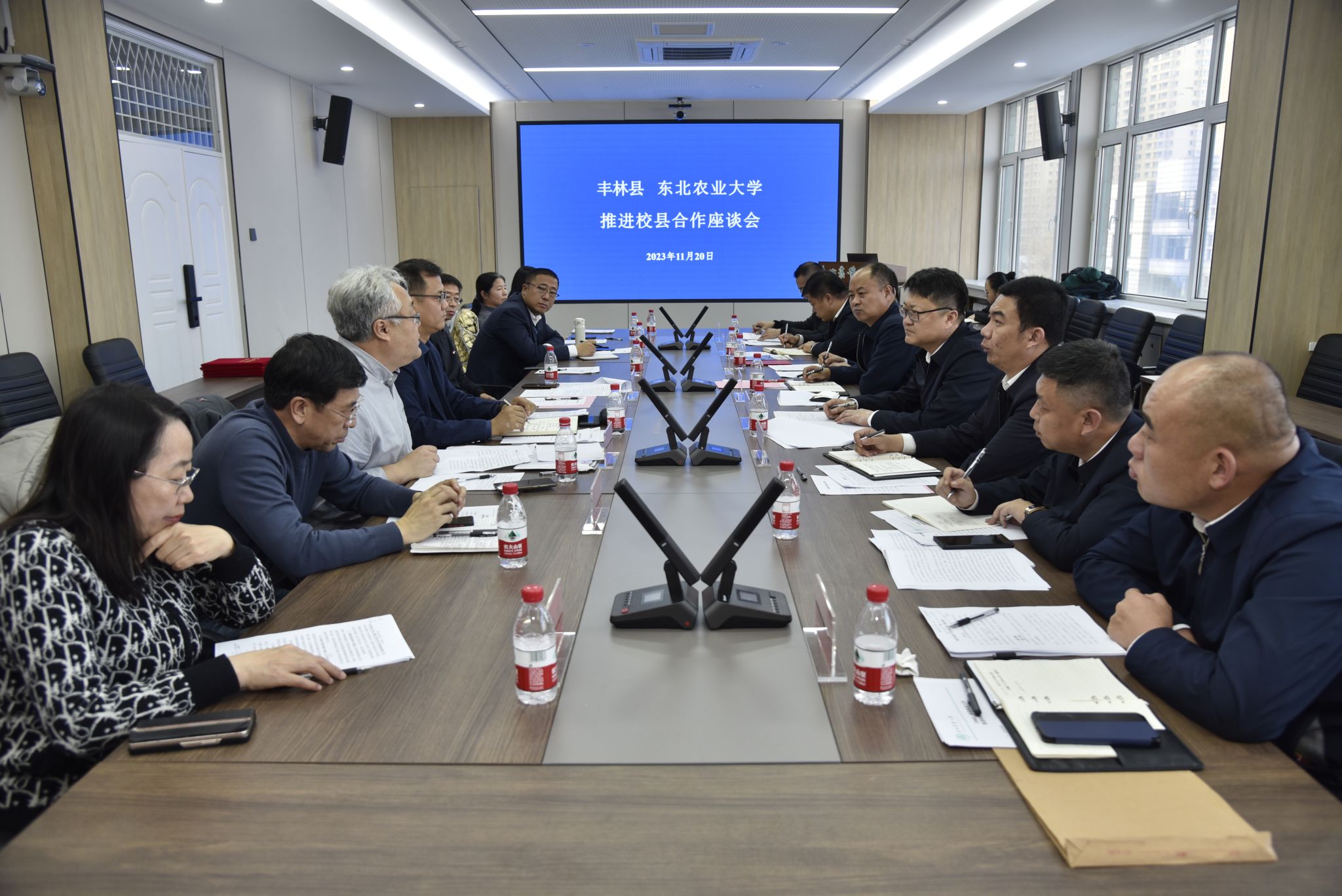 为贯彻落实党的二十大报告提出的“加快建设农业强国,扎实推动乡村产业、人才、文化、生态、组织振兴”,进一步加强丰林县与东北农业大学开展多渠道、多层次、多形式的深入交流与合作,11月20日,丰林县县委书记姜治富,县委常委、副县长王辉,县委常委、组织部部长、新青镇党委书记赵覃,县委办公室主任刘宇、发展和改革局局长邓建磊、农业农村局局长庄严、林业和草原局局长孟鸿宇、伊春市忠芝大山王酒业有限公司总经理谢博文一行8人赴东北农业大学推进校县合作工作。东北农业大学副校长孙占峰、社会合作与成果转化中心(新农村发展研究院)主任(院长)朱志猛、招生就业处处长宋跃芬、艺术学院院长刘丹、社会合作与成果转化中心(新农村发展研究院)副主任(副院长)李其林、园艺园林学院教授霍俊伟、食品学院教授张秀玲、植物保护学院教授陈宇飞、资源与环境学院副教授刘华晶、动物科学技术学院副教授宁方勇、经济管理学院副教授赵建出席座谈会。会议由朱志猛主持。