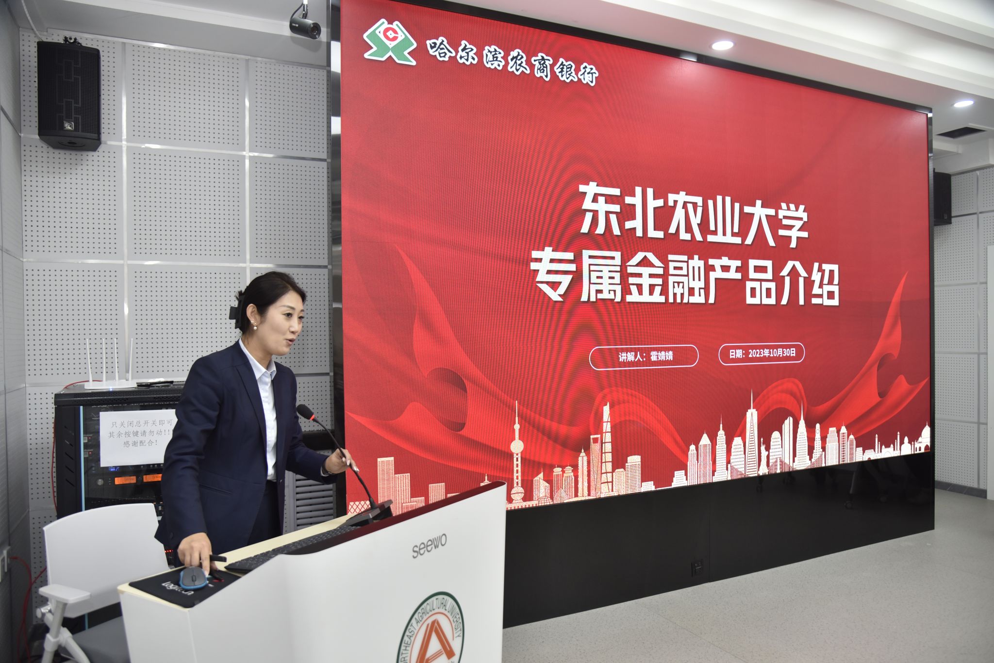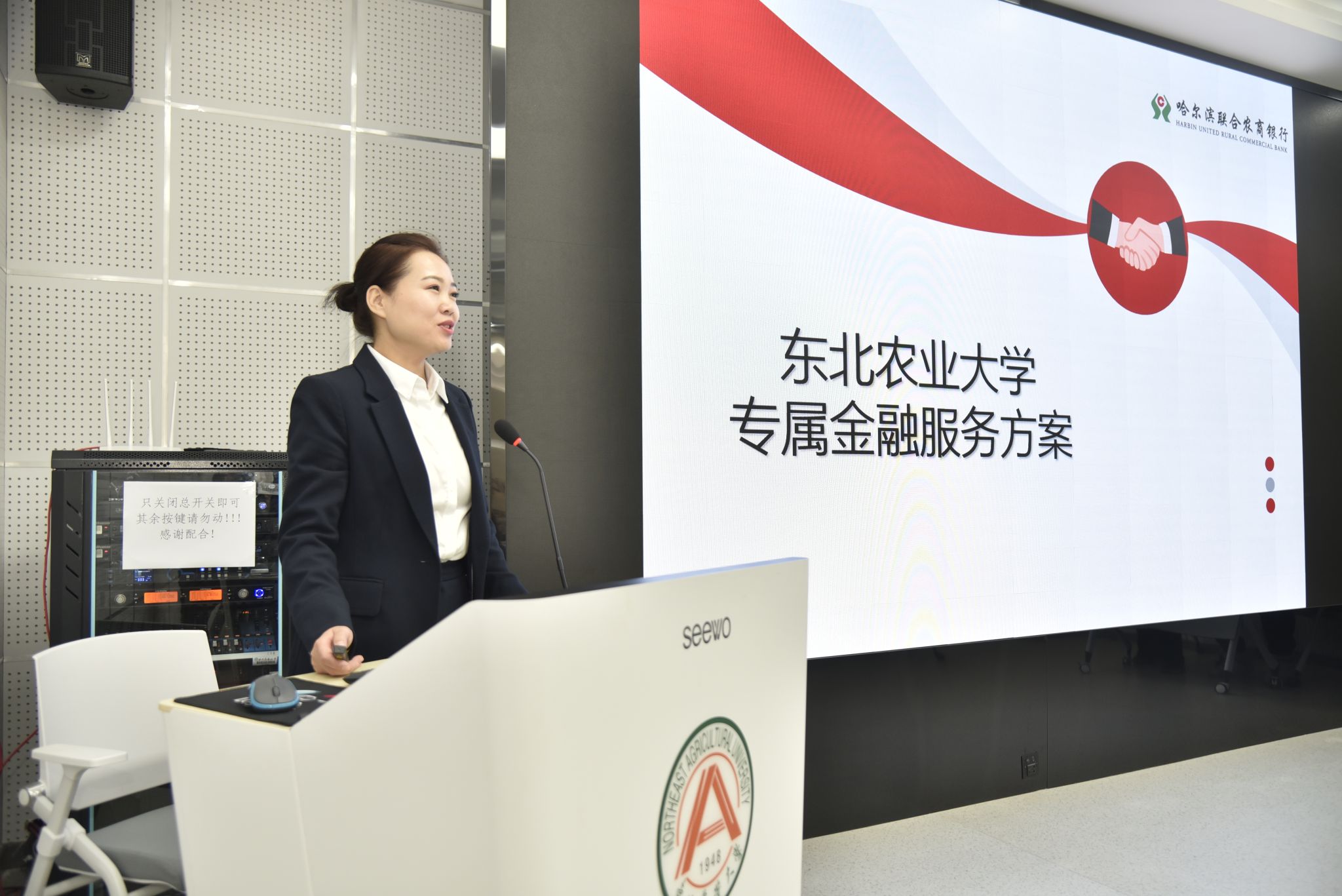 会上,哈尔滨联合农商银行三农及个人业务部总经理徐丽娜与哈尔滨农商银行个人金融部职员霍婧婧分别介绍了哈尔滨联合农商银行与哈尔滨农商银行设计的东北农业大学专属金融服务方案和专属金融产品。