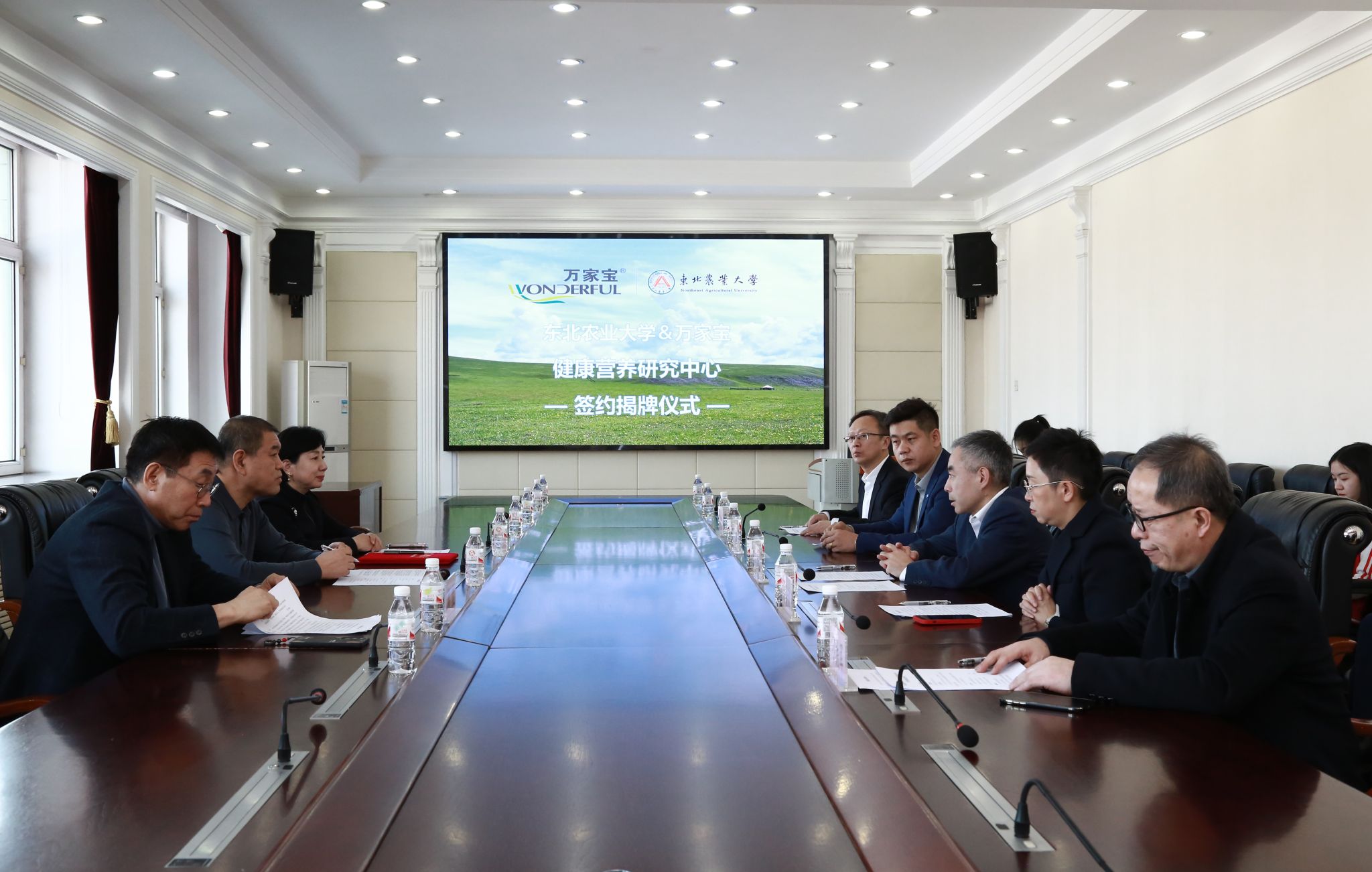 3月6日下午,东北农业大学与万家宝鲜牛奶集团共建“东北农业大学&万家宝健康营养研究中心”签约揭牌仪式在我校举行。万家宝鲜牛奶集团总经理柴宝全、副总经理兼科创有限公司总经理张冰岩、副总经理韩俊,我校副校长孙占峰,食品学院党委书记潘俊波、院长姜毓君、副院长刁铁军,社会合作与成果转化中心(新农村发展研究院)党总支书记王伟峰参加了签约揭牌仪式。签约揭牌仪式由王伟峰主持。