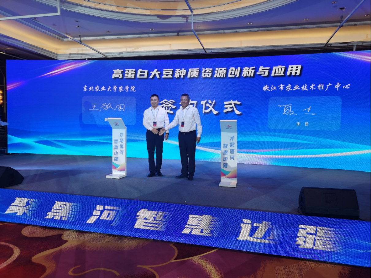 在集中签约会上,孙占峰代表学校与北安市人民政府签订了“校地合作产学研战略协议书”,双方达成共同意向,将以最大限度发挥各自优势资源,聚焦共建东北农业大学现代农业良种繁育北安试验基地,东北农业大学企业科技创新北安研发基地,东北农业大学科研成果转化北安延伸基地“三大平台”,加快北安农业产业化发展,提升市域农业产业竞争力,为北安市乃至黑河地区可持续发展“插上科技翅膀”。王敬国代表农学院与嫩江市农业技术推广中心签订“高蛋白大豆种质资源创新与应用协议”。农学院科技成果在嫩江市进行示范推广,为嫩江农业生产提供技术支撑。同时,开展多种形式的农业人才培养和培训,全面提高嫩江市农业科技水平。