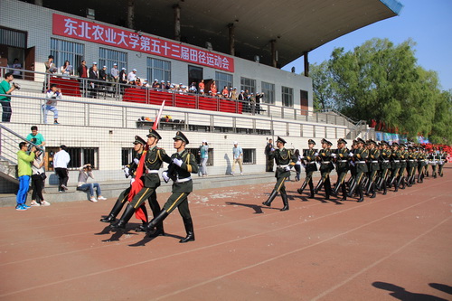 伴随着激昂的运动员进行曲,军装笔挺,英姿飒爽,踏着整齐步伐的国旗护卫队托着五星红旗拉开了入场式的帷幕。由教师和学生组成的25个单位的方队依次入场,他们着装整齐,口号响亮,精神饱满,步伐有力,他们满怀激情的走过主席台,展示了东农师生积极向上、乐观进取、奋力拼搏的精神风貌。