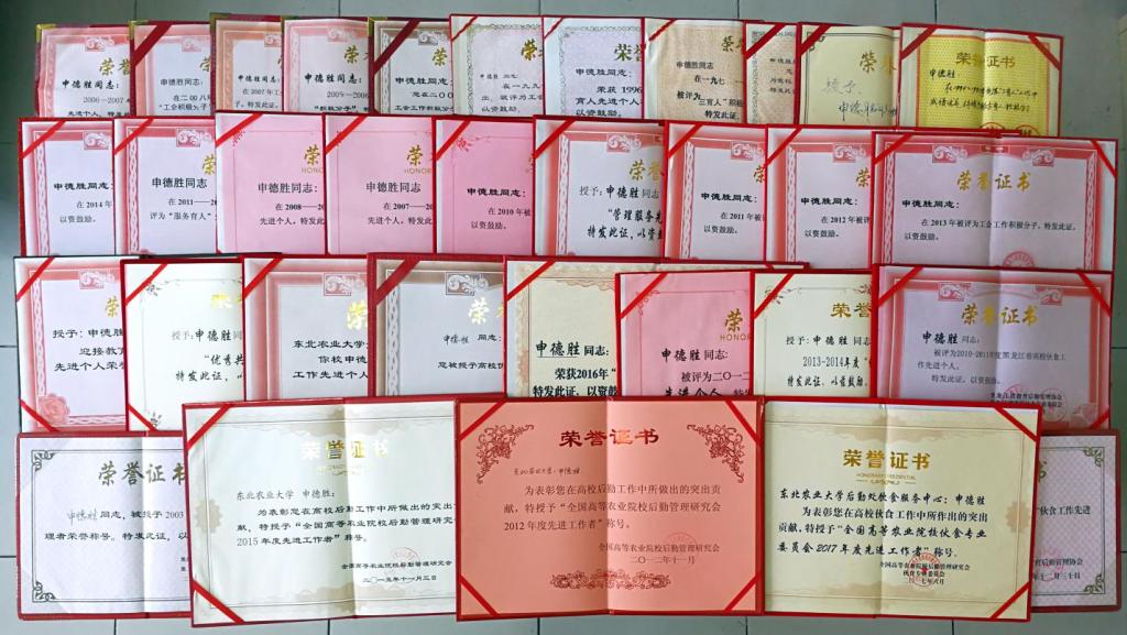申德胜用执着和坚守在自己热爱的事业中默默耕耘了三十六载。数十次被授予各级各类的荣誉表彰:全国高等农业院校后勤“先进工作者”;龙江高校后勤工匠;黑龙江省高校伙食工作“先进工作者”、“优秀管理者”;校“优秀共产党员”、“管理服务先锋”、“服务育人先进个人”等荣誉。