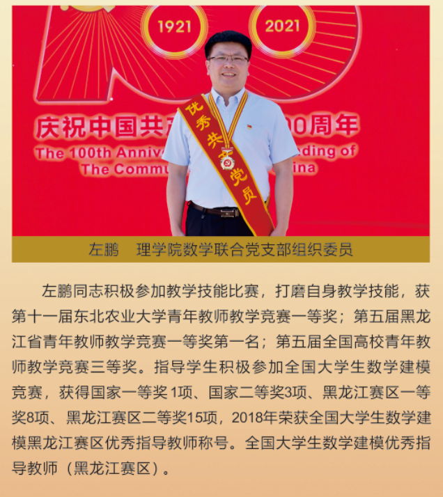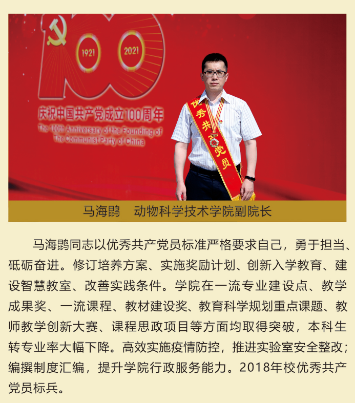 伟大时代呼唤伟大精神,崇高事业需要榜样引领。在庆祝中国共产党成立100周年之际,学校党委面向全校评选出一批先进基层党组织以及优秀共产党员和党务工作者。从三尺讲台到千里沃野,从党政管理到后勤服务,从默默钻研数十载的学者教授到争做时代先锋的优秀学子,从每个学生都关怀备至的辅导员到兢兢业业的保洁人员,一名党员就是一面旗帜,一个组织就是一座堡垒。这些共产党员先优代表在平凡的岗位上用执着坚守书写了东农人教育报国的不变初心,以无私奉献诠释了东农老师立德树人的光荣使命,为新时代祖国农业现代化事业的发展注入了源于东农的勃勃生机!为更好地宣传好先优事迹,凝聚东农奋斗力量,宣传部特开设栏目《东北农业大学庆祝建党100周年暨“两优一先”事迹展》,进行专题报道。