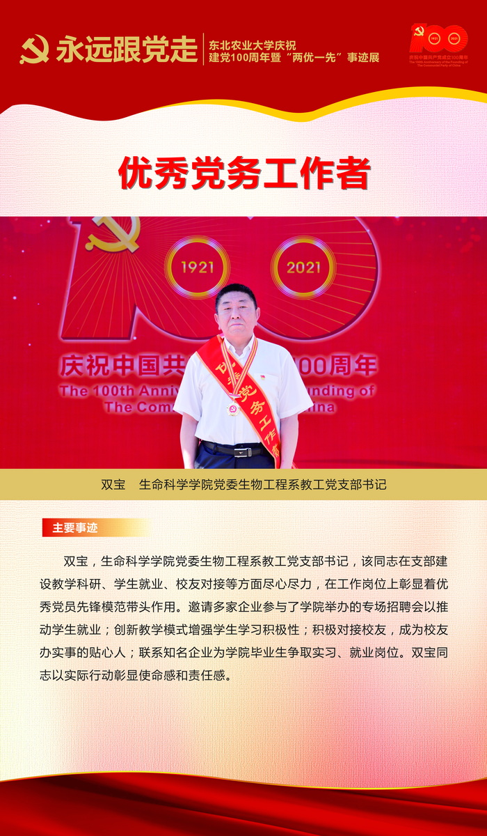 伟大时代呼唤伟大精神,崇高事业需要榜样引领。在庆祝中国共产党成立100周年之际,学校党委面向全校评选出一批先进基层党组织以及优秀共产党员和党务工作者。从三尺讲台到千里沃野,从党政管理到后勤服务,从默默钻研数十载的学者教授到争做时代先锋的优秀学子,从每个学生都关怀备至的辅导员到兢兢业业的保洁人员,一名党员就是一面旗帜,一个组织就是一座堡垒。这些共产党员先优代表在平凡的岗位上用执着坚守书写了东农人教育报国的不变初心,以无私奉献诠释了东农老师立德树人的光荣使命,为新时代祖国农业现代化事业的发展注入了源于东农的勃勃生机!为更好地宣传好先优事迹,凝聚东农奋斗力量,宣传部特开设栏目《东北农业大学庆祝建党100周年暨“两优一先”事迹展》,进行专题报道。