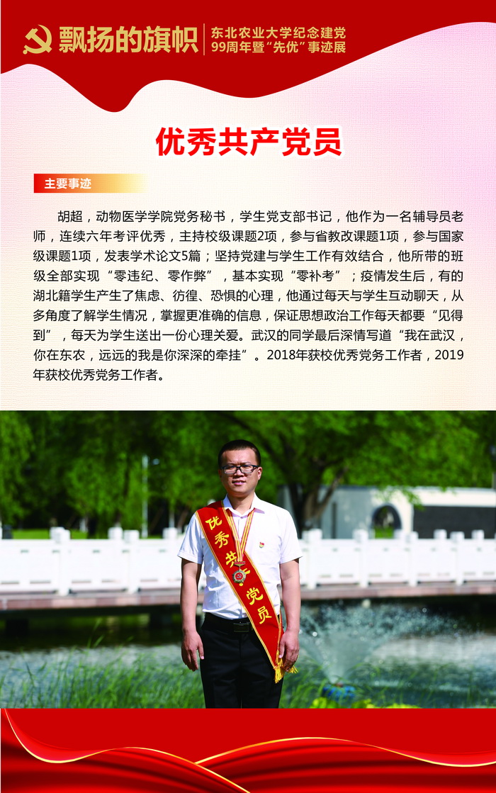 高举旗帜跟党走,创先争优树典型。在建党99周年之际,我校在“七一”当天举行了“飘扬的旗帜——东北农业大学纪念建党99周年暨‘先优’表彰活动”,表彰过去一年里在学校建设发展、疫情防控中涌现出来的先进集体和优秀个人。此次表彰学校共评选出先进基层党组织18个,优秀共产党员68人,优秀党务工作者21人,疫情防控党员先锋8人。这些先进集体和优秀个人信念坚定、业绩突出、群众公认,综合素质全面过硬,是我校各条战线上的优秀代表,体现了新时代共产党员的精神风貌,诠释了新时代东农人的优秀品质。