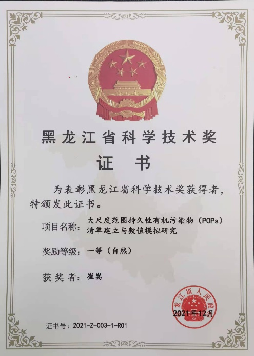 编制全球第一份国家尺度典型POPs网格化使用/排放/残留清单,明确了POPs汇源关系与二次排放残留影响机制,开发了大尺度范围网格化农药和工业污染物排放残留预测模型,成果获得黑龙江省科学技术一等奖。
