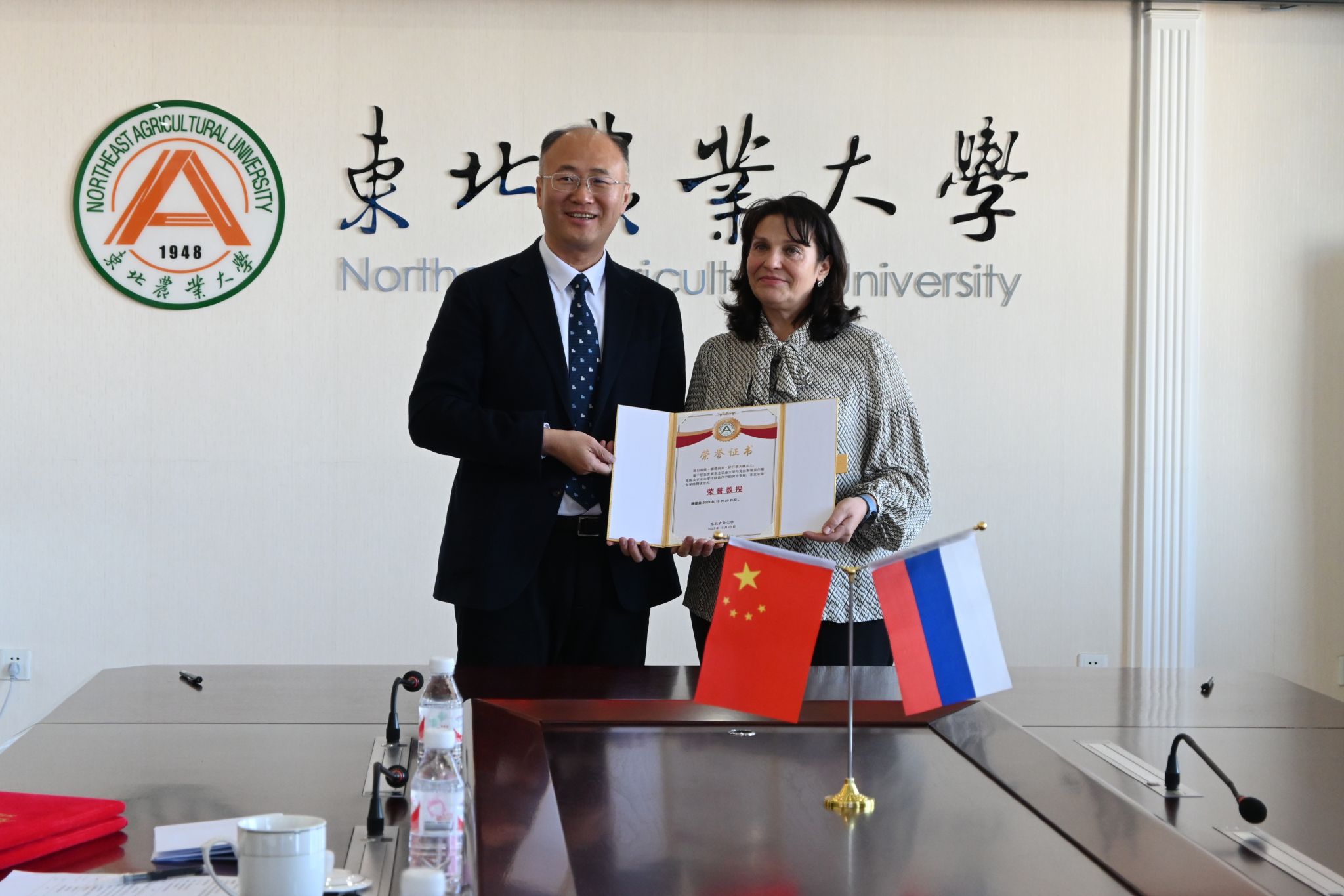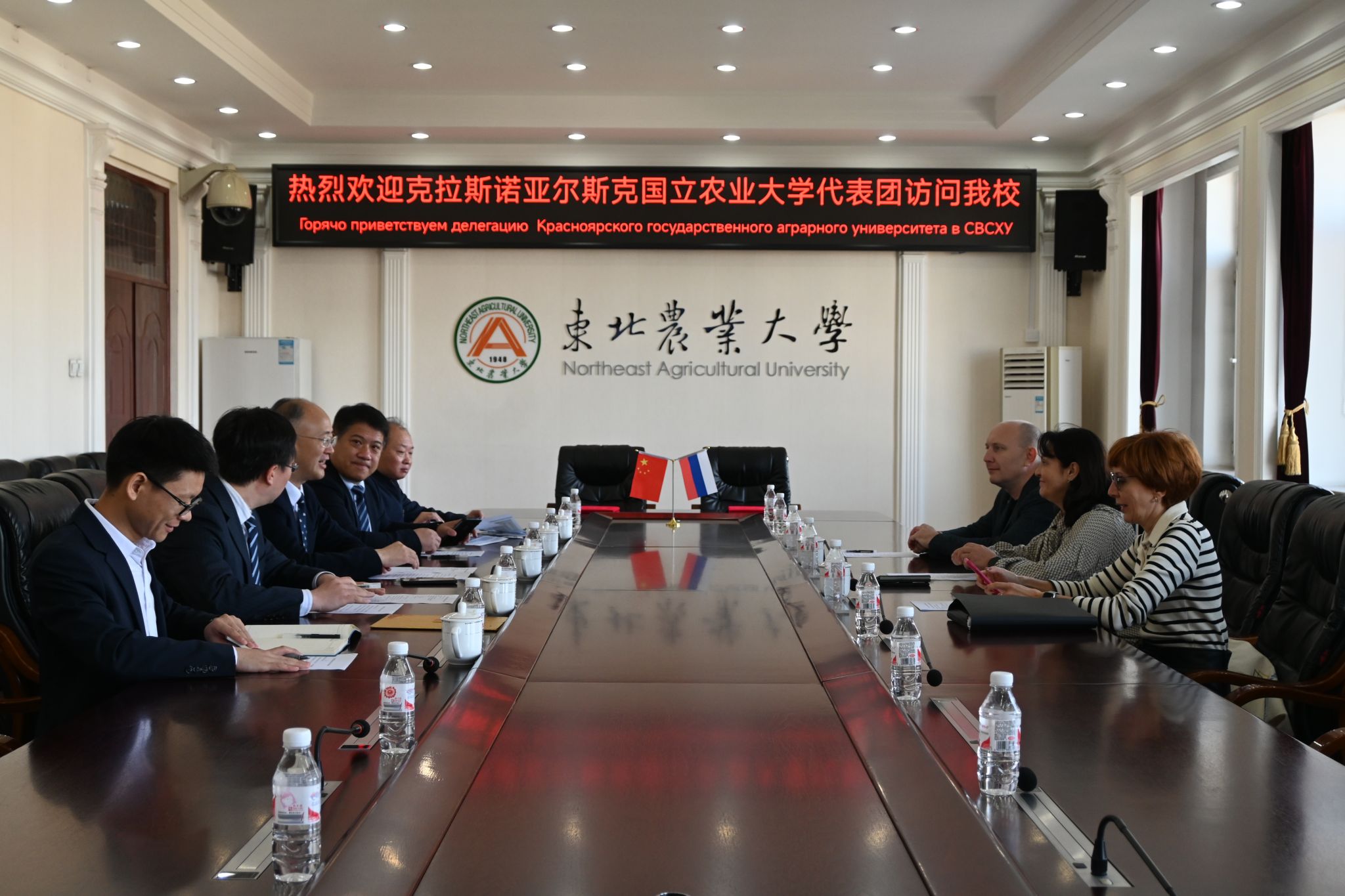 付强对代表团的来访表示热烈欢迎和亲切问候。他表示,克拉斯诺亚尔斯克农业大学代表团此次访问我校意义重大,参加了由我校承办的2023国际产学研用合作会议(哈尔滨),并在教育部副部长孙尧和副省长王合生的见证下与我校共同成立了中俄寒地农业大学联盟。裴日科娃感谢东北农业大学的热情接待。她表示,非常荣幸受邀参加2023国际产学研用合作会议(哈尔滨)。此次会议规格高、规模大,充分展现了东北农业大学国际化水平。成立中俄寒地农业大学联盟对发展俄罗斯远东及西伯利亚地区与中国东北地区农业高校间的教育、科研和人文领域合作起到至关重要的作用,克拉斯诺亚尔斯克国立农业大学愿与东北农业大学精诚合作,发挥联盟俄、中方主席的作用,将联盟打造成最有影响力、最具特色的中俄高校联盟。双方还就进一步扩大互派学生和教师规模、共同申报两国政府间科研合作项目、建立国际联合实验室等问题交换了意见,并达成一致共识。