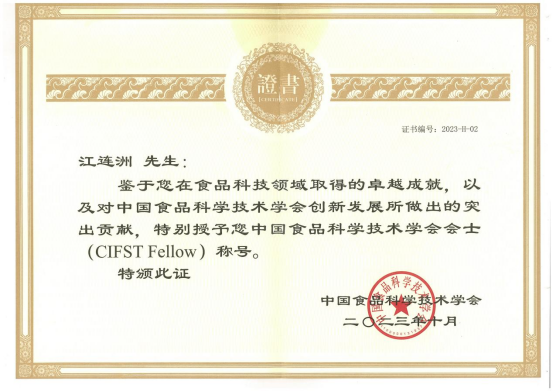 据悉,中国食品科学技术学会会士是中国食品科学技术学会会员的最高荣誉称号,于2022年正式设立。获此称号者需在食品科学及相关领域有重大学术贡献或行业创新,并从有10年以上中国食品科学技术学会会员会龄,为学会的创新发展做出卓越贡献的人员中产生。由3名学会会士推荐,并经会士评审委员会审核通过。