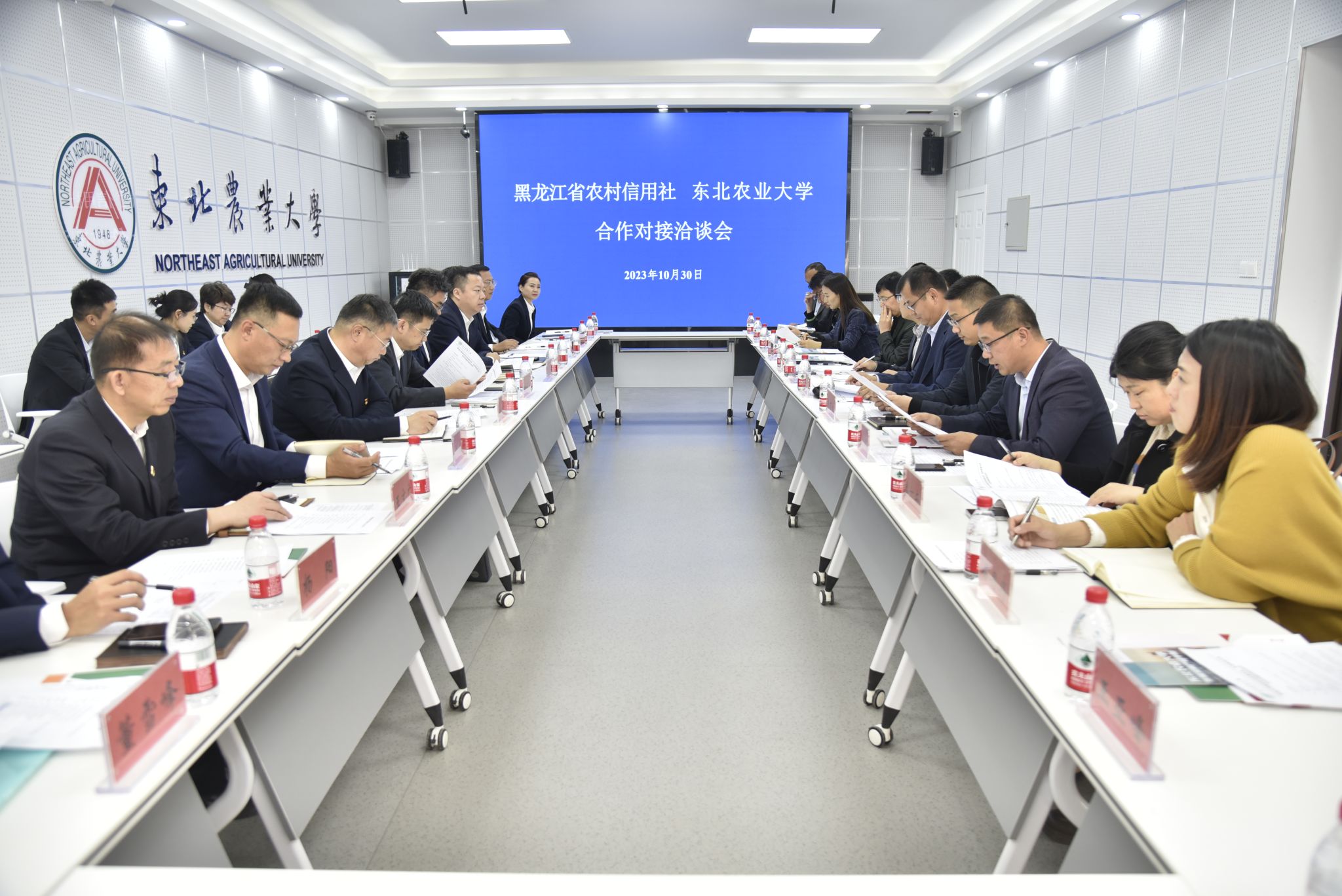 为深入贯彻落实黑龙江省农村信用社联合社(下称省联社)与东北农业大学战略合作协议内容,扎实推进特色金融产品开发、助力科研成果转化、校友企业金融信贷等相关工作,10月30日,省联社主任助理展昭海,信息科技部副部长孙彦东,三农业务部业务主管刘东仁、刘连芳,战略发展部业务主管臧皓楠,网络金融部业务主管王文广、徐辉,哈尔滨联合农商银行总行副行长姚刚、哈尔滨农商银行副行长牟振宇等一行20人来我校开展合作对接洽谈。我校社会合作与成果转化中心(新农村发展研究院)主任(院长)朱志猛、电气与信息学院行政负责人戴百生、经济管理学院副院长余志刚、社会合作与成果转化中心(新农村发展研究院)副主任(副院长)宋珲、现代教育技术中心副主任邢金阁、电气与信息学院副院长李晓明,经济管理学院金融系教授潘方卉等参加合作对接洽谈会。会议由宋珲主持。