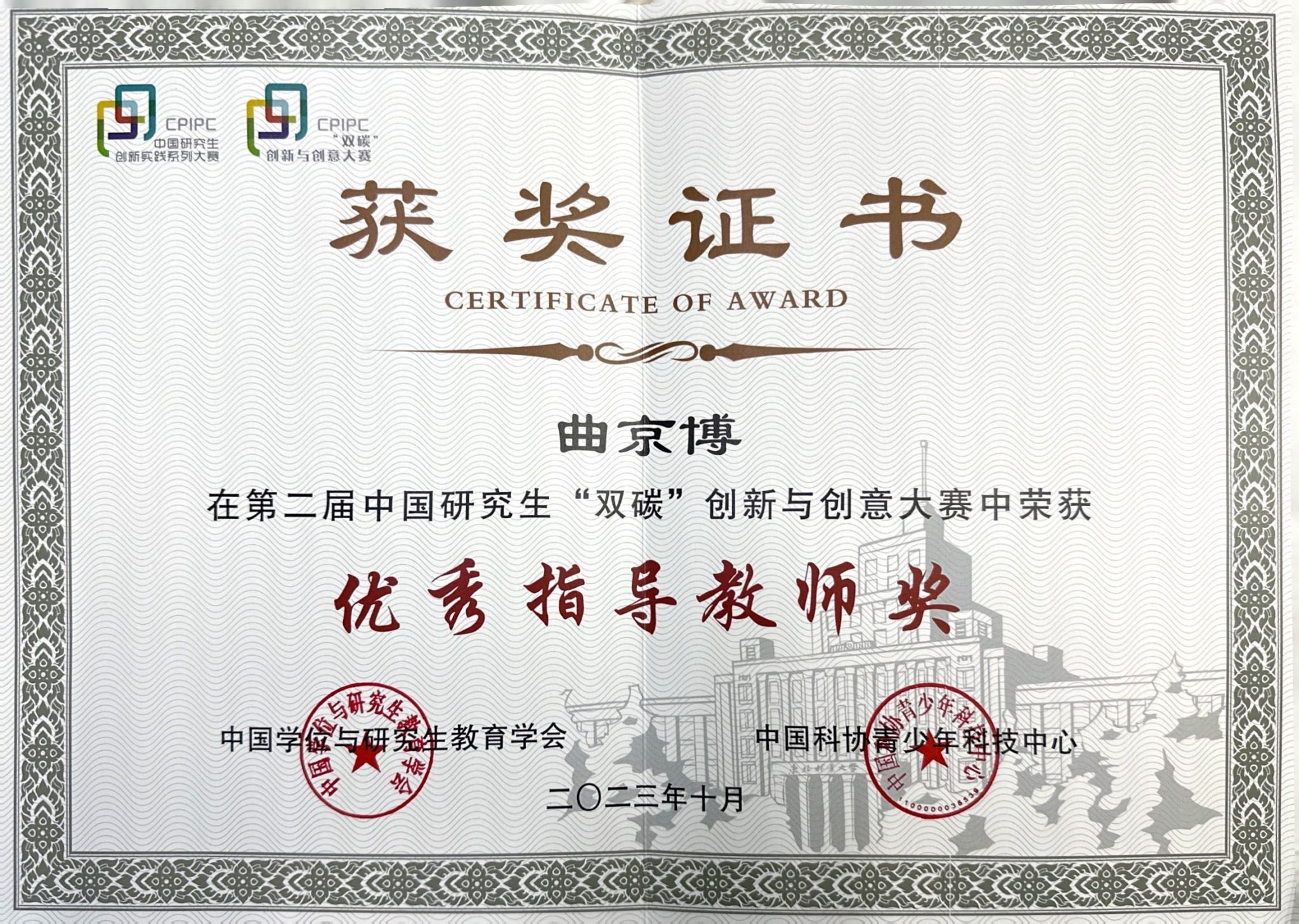 曲京博荣获优秀指导教师奖