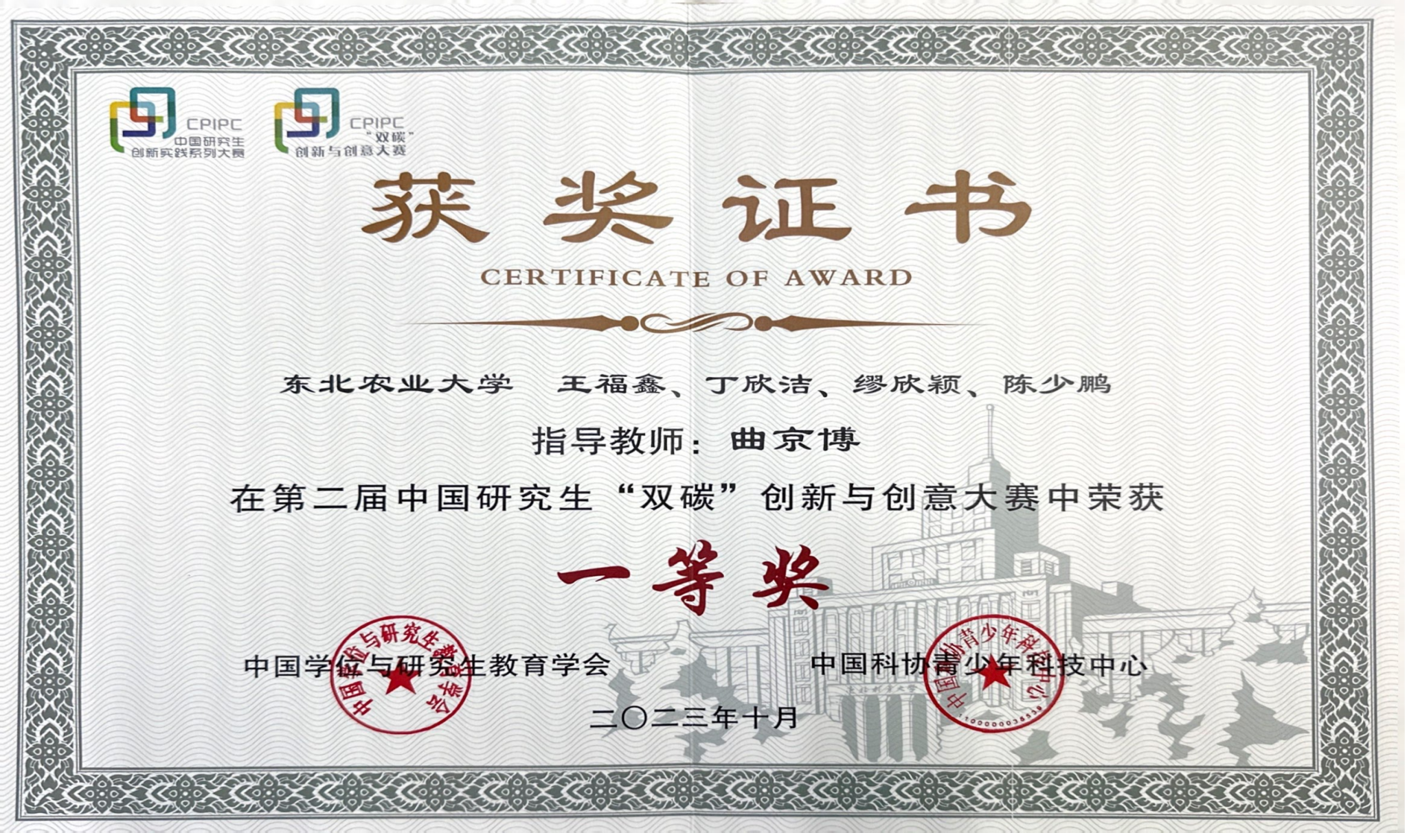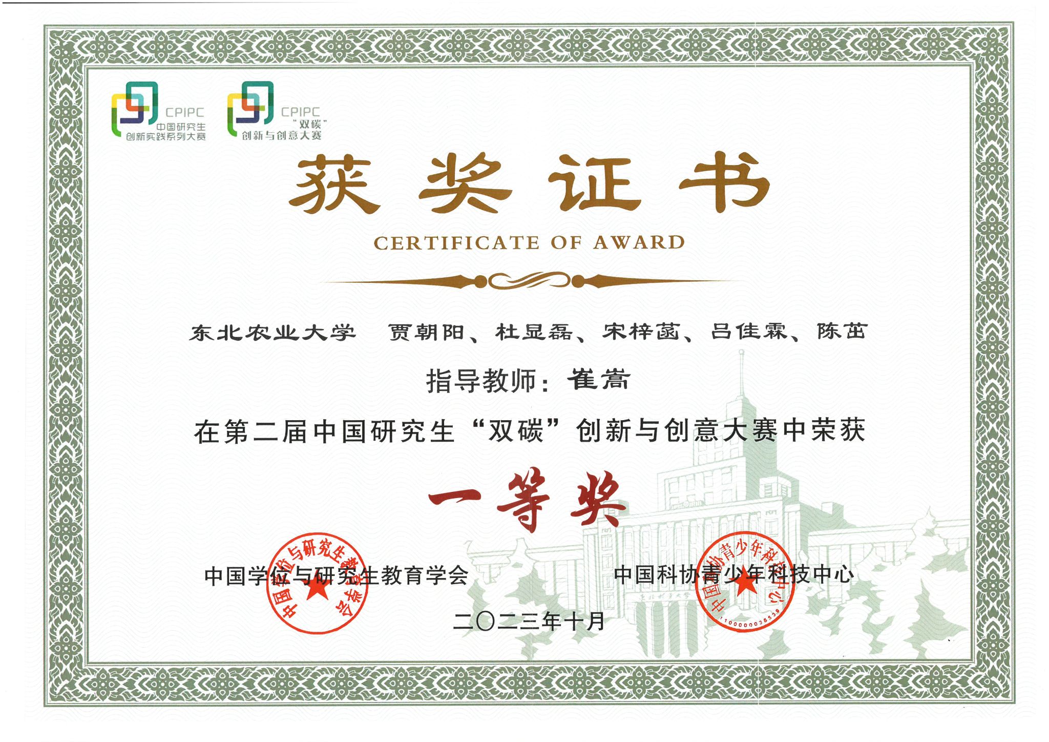 10月29日,由教育部学位管理与研究生教育司指导,中国学位与研究生教育学会和中国科协青少年科技中心共同主办,东北林业大学承办的第二届中国研究生“双碳”创新与创意大赛落下帷幕。我校共获得一等奖2项、二等奖4项、三等奖9项,其中工程学院参赛作品《植物营养型苗钵的制备:黑土增汇新方法》获得季军,并荣获一等奖,水利与土木工程学院参赛作品《土壤固碳增汇与农田减污降碳协同治理技术》荣获一等奖。我校荣获全国优秀组织奖,工程学院指导教师曲京博、水利与土木工程学院教授崔嵩荣获优秀指导教师奖。