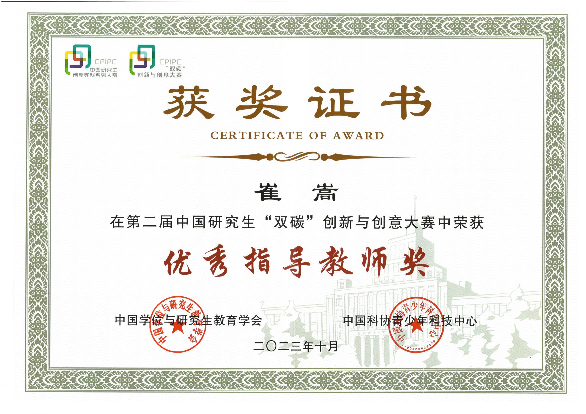 崔嵩荣获优秀指导教师奖