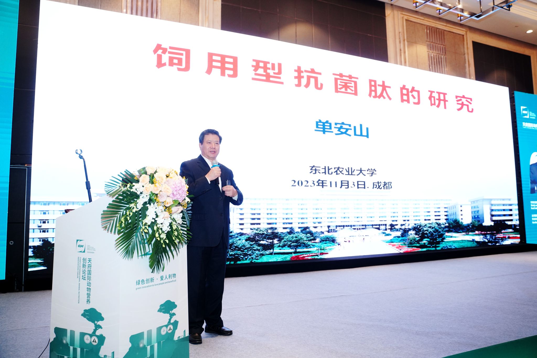 11月1日至3日,天府国际动物营养创新论坛在四川成都召开,我校动物科学技术学院教授单安山受邀以《饲用型抗菌肽的研究》为题作大会主题报告,系统介绍了团队二十余年来在饲用型抗菌肽研发上取得的重要创新成果,得到与会专家学者的高度评价和热烈讨论。