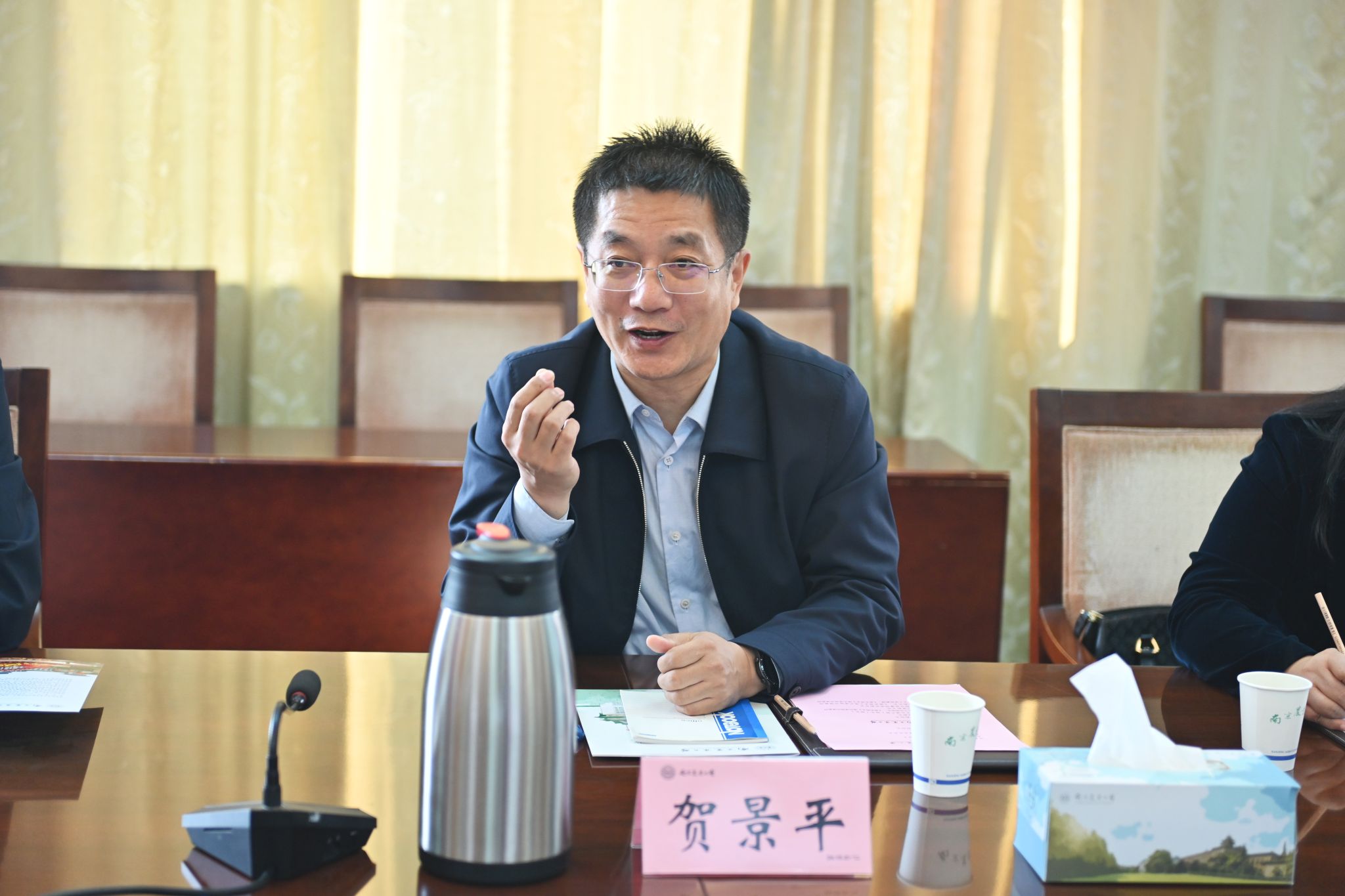 9日,贺景平带队来到南京林业大学。南京林业大学校长勇强接待调研组一行,副校长张晓琴出席座谈会。