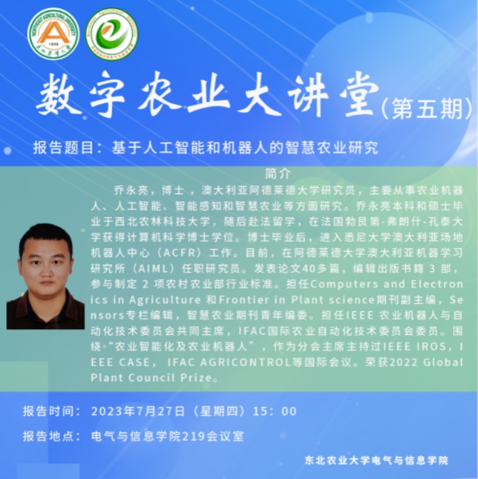 “十三五”以来,电气与信息学院与国内外同类高校积极开展学术交流活动,主办了全国粮食主产区智慧农业发展论坛,黑龙江省计算机学会智慧农业专业年会,邀请罗锡文院士莅临农业农村部东北智慧农业技术重点实验室指导,举办了“数字农业大讲堂”,打造品牌学术交流平台。学院鼓励教师参加国内外著名高校组织的国际学术研讨活动,组织教师线上参加了2022中俄数字经济高峰论坛,邀请美国北卡罗来纳大学教堂山分校医学院助理教授王利博士作了关于人工智能应用的线上学术报告会等,极大地促进了国内外、校内外、学科间的多维度交叉融合。