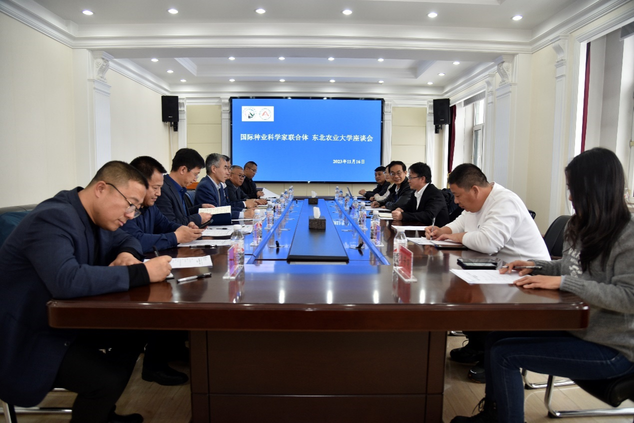 为深入调研了解黑龙江省大豆种植、育种、深加工产业发展情况,以及东北农业大学在人才培养,成果转化等方面的做法经验,11月16日,中国农业国际合作促进会书记、三亚国际种业科学家联合体副主任兼执委会主任李立,中国农业国际合作促进会常务理事、海南鸣遥投资(合伙)有限公司董事长瞿建国,中国农业国际合作促进会技术转化分会副会长、三亚国际种业科学家联合体执委会副主任张孟玉,中国农业国际合作促进会技术转化分会政企业务部副主任王志涛、中国农业国际合作促进会技术转化分会政策研究室主任仝玫、中国农业国际合作促进会技术转化分会政工干事刘芳明、海南鸣遥投资(合伙)有限公司经理刘宏心一行7人来我校洽谈合作事宜。东北农业大学副校长孙占峰、社会合作与成果转化中心(新农村发展研究院)主任(院长)朱志猛、科学技术处处长寇胜利、研究生院院长刘世英、农学院院长陈庆山、社会合作与成果转化中心(新农村发展研究院)副主任(副院长)李其林、食品学院副教授齐宝坤、教务处教学管理科科长牛海燕参加了座谈会。会议由朱志猛主持。